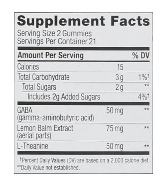 OLLY Goodbye Stress has expertly blended ingredients to help keep you calm and alert when you need it most.* GABA starts working within 30-60 minutes to support a relaxed state of mind in moments of occasional stress. It partners up with L-Theanine, an amino acid that goes right to work in your brain to help you keep your cool.* Lemon Balm Extract is a traditional botanical that has been used for centuries. These gummies are a delightful addition to your routine. Take two and chew thoroughly before swallowing. Flavored with a zen blend of strawberry and lemon verbena flavors with other natural flavors. Formulated with no synthetic flavors or colors and gluten free. *These statements have not been evaluated by the Food and Drug Administration. This product is not intended to diagnose, treat, cure or prevent any disease. • Olly Public Benefit Corp, San Francisco,CA,94129 • Packaging: Reusable