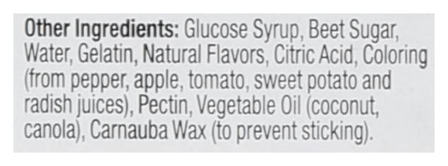 Ingredients: Other Ingredients: Glucose Syrup, Beet Sugar, Water, Gelatin, Natural Flavor, Citric Acid, Coloring (from Pepper, Apple, Tomato, Sweet Potato and Radish Juices), Pectin, Vegetable Oil (Coconut, Canola) and Carnauba Wax (to Prevent Sticking) Contains: Tree Nuts, Coconuts, Soybeans, Eggs, Peanuts, Tree Nuts, Milk, Crustacean Shellfish, Molluscan Shellfish, Wheat, Sesame, Fish