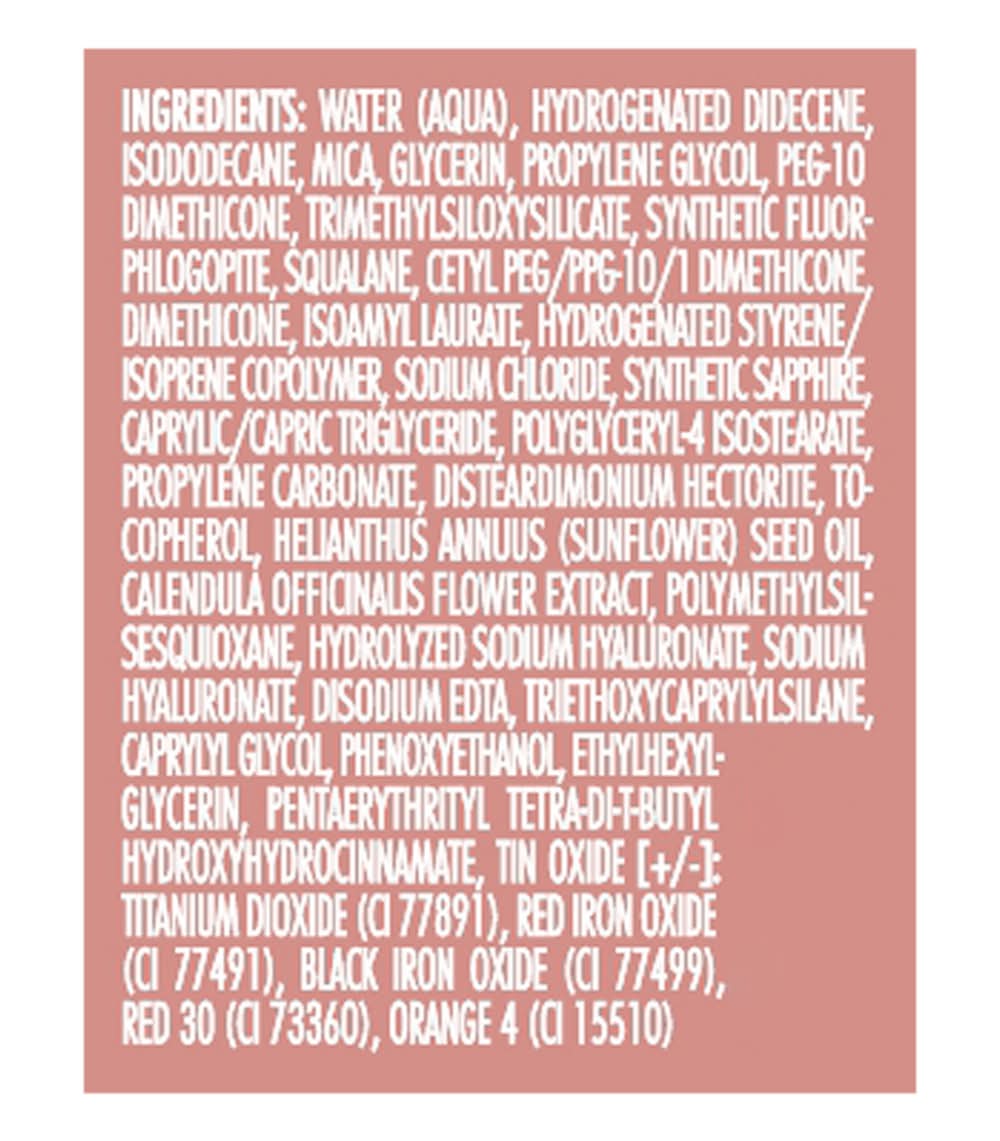 Ingredients: Water (Aqua), Hydrogenated Didecene, Isododecane, Mica, Glycerin, Propylene Glycol, PEG-10 Dimethicone, Trimethylsiloxysilicate, Synthetic Fluorphlogopite, Squalane, Cetyl PEG/PPG-10/1 Dimethicone, Dimethicone, Isoamyl Laurate, Hydrogenated Styrene/Isoprene Copolymer, Sodium Chloride, Synthetic Sapphire, Caprylic/Capric Triglyceride, Polyglyceryl-4 Isostearate, Propylene Carbonate, Disteardimonium Hectorite, Tocopherol, Helianthus Annuus (Sunflower) Seed Oil, Calendula Officinalis Flower Extract, Polymethylsisesquioxane, Hydrolyzed Sodium Hyaluronate, Sodium Hyaluronate, Disodium EDTA, Triethoxycaprylylsilane, Caprylyl Glycol, Phenoxyethanol, Ethylhexyl Glycerin, Pentaerythrityl Tetra-Di-T-Butyl Hydroxyhydrocinnamate, Tin Oxide [+/-]: Titanium Dioxide (CI 77891), Red Iron Oxide (CI 77491), Black Iron Oxide (CI 77499), Red 30 (CI 73360), Orange 4 (CI 15510)