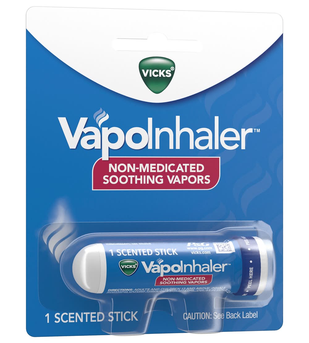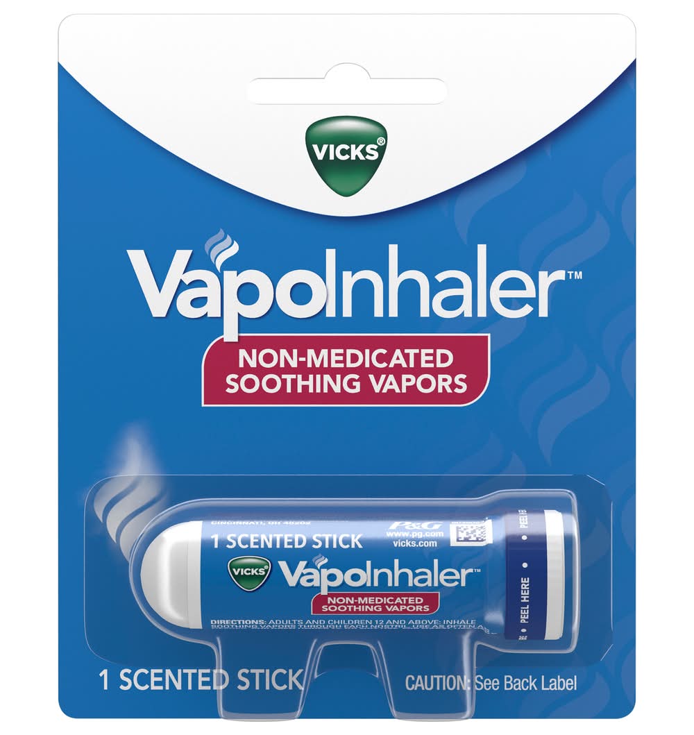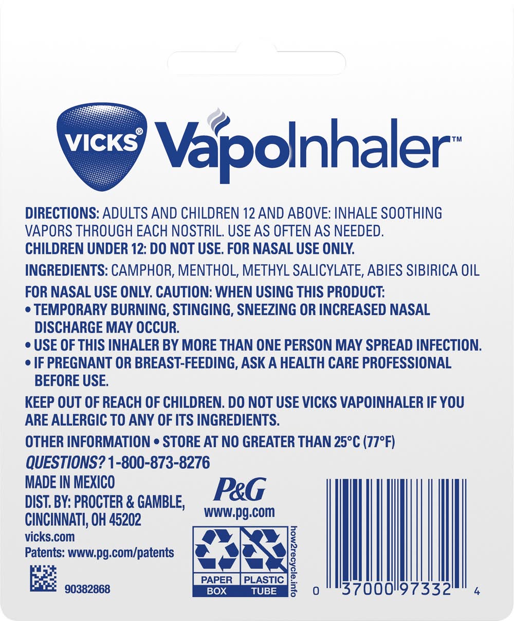 VapoInhaler is a convenient non-medicated nasal inhaler formulated with a proprietary blend of ingredients including menthol & camphor so you can experience non-medicated soothing vapors. It's easy to use - just inhale the soothing & refreshing non-medicated vapors through each nostril and use as often as you need to. It's also easy to carry - take it with you in your purse or pocket so you can discretely enjoy the soothing non-medicated vapors you need to make it through the day. For Adults. Not recommended for use by children under 12.Non-medicated. Not intended to treat cold or flu symptoms. • Size: 1 CT • Procter & Gamble, Cincinnati,OH,45202 • Medical prescription is required