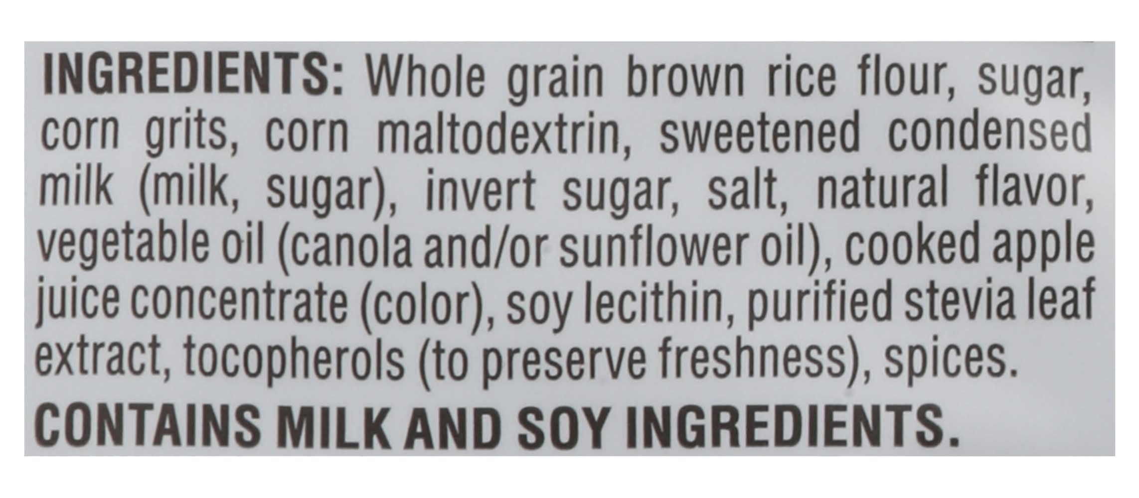 Ingredients: Whole Grain Brown Rice Flour, Sugar, Degerminated Milled Corn, Corn Maltodextrin, Sweetened Condensed Milk (Milk, Sugar), Invert Sugar, Salt, Natural And Artificial Flavor, Sunflower Oil, Soy Lecithin, Caramel Color, Sucralose, Acesulfame Potassium, Tocopherols (Preservative). Contains Milk And Soy Ingredients. Contains: Contains Milk And Soy Ingredients.