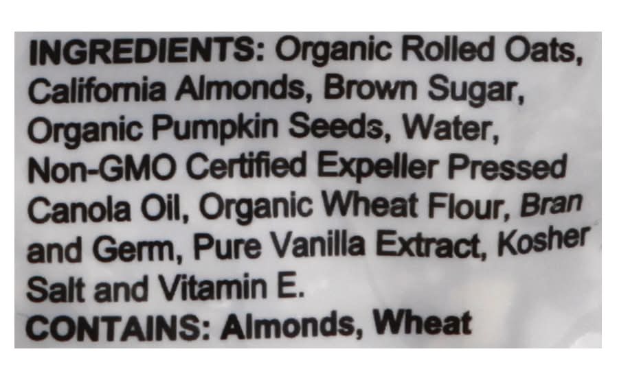 Organic Rolled Oats, California Almonds, Brown Sugar, Organic Pumpkin Seeds, Water, Non-GMO Certified Expeller Pressed Canola Oil, Organic Wheat Flour, Bran and Germ, Pure Vanilla Extract, Kosher Salt and Vitamin E Contains: Tree Nuts, Wheat