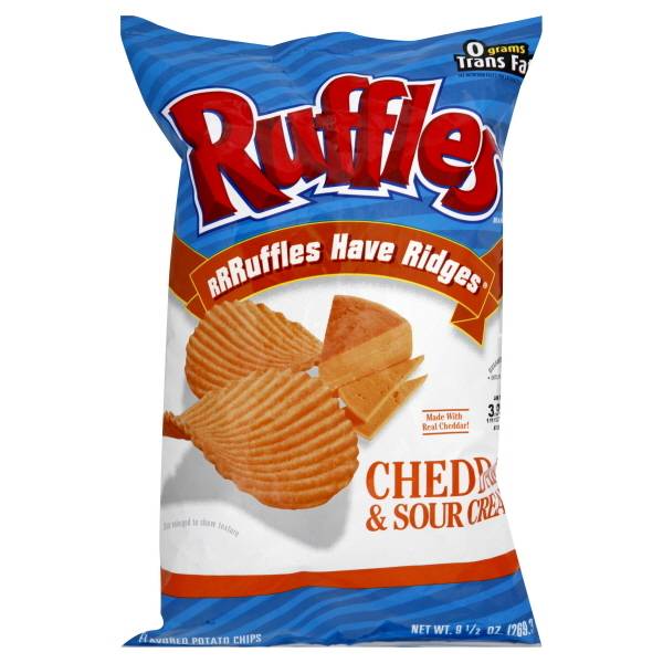 Our Potato Chips, are crisp and ridged potato snacks that come with a freshness guarantee until the printed date on the packaging. These chips are part of a snack lineup that can be enjoyed on various occasions. • Brand: Ruffles • Flavor: Cheddar-sour cream