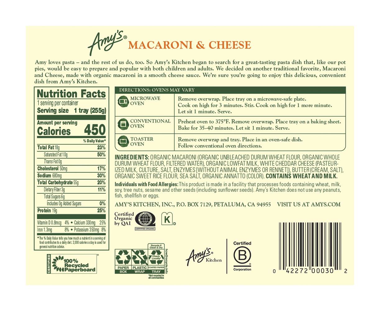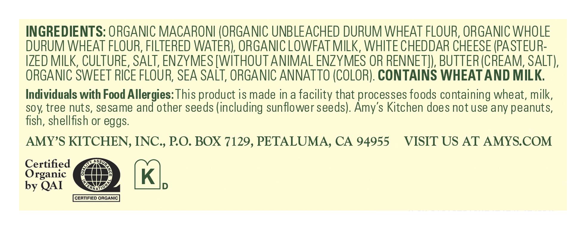 Made with organic pasta. Certified Organic by QAI. Certified Organic by Quality Assurance International. If it's organic it's non GMO. A delicious family favorite. Amy's loves pasta- and the rest of us do, too. So Amy's Kitchen began to search for a great-tasting pasta dish that, like our pot pies, would be easy to prepare and popular with both children and adults. We decided on another traditional favorite, Macaroni and Cheese, made with organic macaroni in a smooth cheese sauce. We're sure you're going to enjoy this delicious, convenient dish from Amy's kitchen. From our home to yours. Family Owned Since 1987: After the birth of our daughter Amy in 1987, we found there was little time to prepare the quality homemade food we normally ate. Realizing there were others like ourselves, we started Amy's Kitchen to prepare delicious meals for those who care about the food they eat but are often too busy to cook. We use only the finest ingredients and prepare them with the same careful attention in our kitchen as you would in your own home. No meat, fish, shellfish, poultry, eggs or peanuts are ever used in any Amy's products. Lentil Vegetable. • Amy's Kitchen Inc., PO Box 7129,Petaluma,CA,94955 • Packaging: Reusable