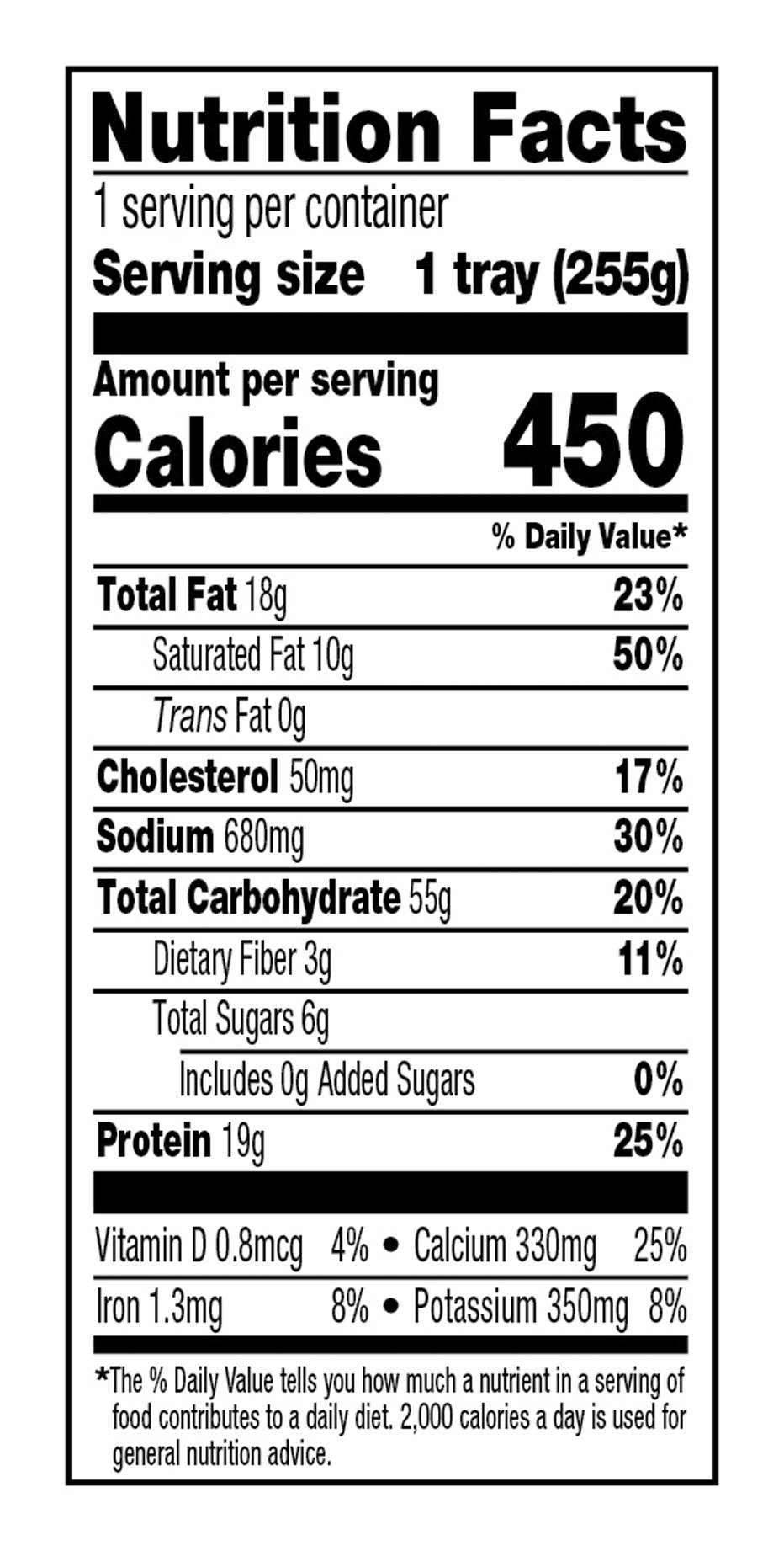 Directions for use: Microwave or regular oven. Directions: Ovens May Vary. Microwave Oven: Remove overwrap, place tray on a microwave-safe plate. Cook on high for 3 minutes. Stir. Cook on high for 1 more minute. Let sit 1 minute. Serve. Conventional Oven: Preheat oven to 375 degrees F. Remove overwrap. Place tray on a baking sheet. Bake for 35-40 minutes. Let sit 1 minute. Serve. Toaster Oven: Remove overwrap and tray. Place in an oven-safe dish. Follow conventional oven direction. Perishable. Keep frozen. Storage recommendation: Perishable. Keep frozen.