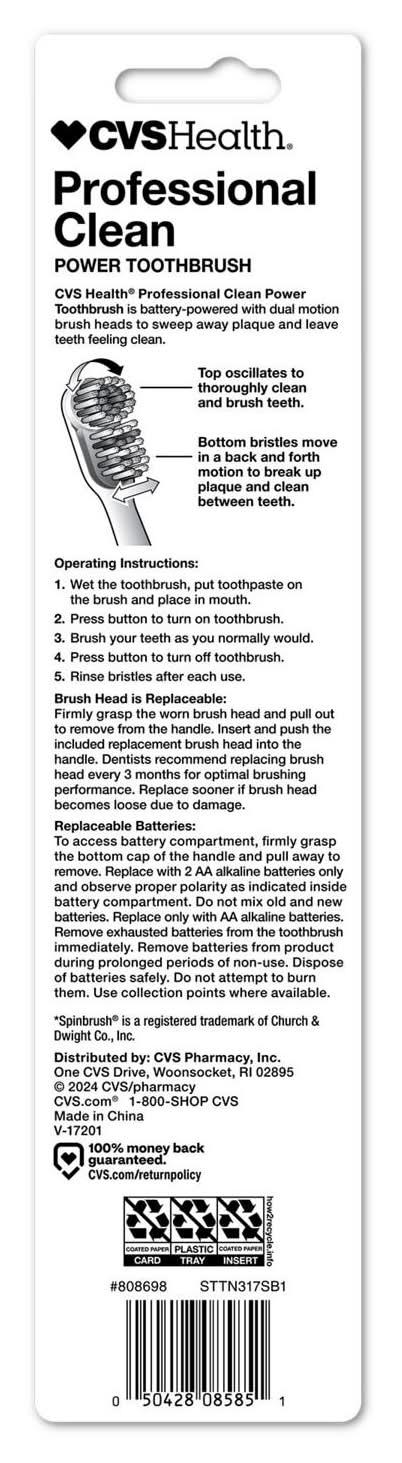Helps remove plaque. High rotation dual zone brush head. Bonus replacement brush head. Compare to Arm & Hammer Spinbrush Pro Clean (This product is not manufactured by the Church & Dwight Co. Inc. owners of the Arm & Hammer and Spinbrush Trademark). 2 AA batteries included. CVS Health Professional Clean Power Toothbrush is a battery operated toothbrush with a patented high rotation motion to sweep away plaque and actively clean teeth for a professional clean feeling. High Rotation Dual Zone Cleaning Power: The Dual Zone brush head has a top oscillating brush head that breaks up plaque and the bottom bristles clean between the teeth. One replacement head included. Made in China.