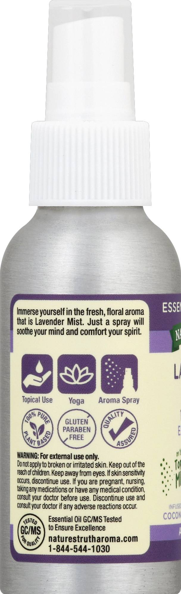 Made with 100% pure essential oil. On the go tropical mist. Infused with coconut oil. Aromatherapy. Immerse yourself in the fresh, floral aroma that is lavender mist. Just a spray will soothe your mind and comfort your spirit. Topical use. Yoga. Aroma spray. 100% pure plant based. Gluten paraben free. Quality assured. GC/MS for quality. GC/MS tested to ensure excellence. naturestrutharoma.com. Nature's Truth, Ronkonkoma, NY 11779 USA