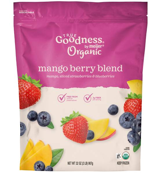A perfect balance of sweet, tart and tropical, True Goodness Organic Frozen Mango Berry Blend shows the difference wholesome ingredients make. A delightful mix of strawberries, blueberries and mangos, this blend is perfect for smoothies, yogurt bowls, or to add a sweet twist to your ice cream! Packaging: Reusable