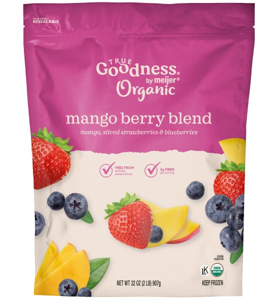 A perfect balance of sweet, tart and tropical, True Goodness Organic Frozen Mango Berry Blend shows the difference wholesome ingredients make. A delightful mix of strawberries, blueberries and mangos, this blend is perfect for smoothies, yogurt bowls, or to add a sweet twist to your ice cream! Packaging: Reusable