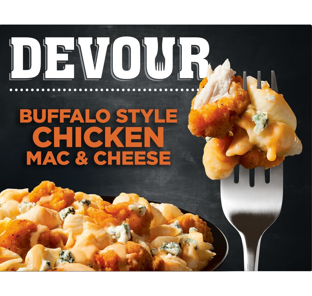 DEVOUR Buffalo Style Chicken Mac & Cheese dials up the taste, maxes out the flavor and turns up the texture with this easy to make single serve frozen dinner. This hearty macaroni and cheese meal is sure to satisfy big appetites. We combined perfectly cooked pasta shells with crispy breaded chicken and then drenched it in creamy buffalo style cheddar sauce. Finally, we topped it all with rich blue cheese to cool you down just right. Ready to eat in minutes, this 12 ounce frozen buffalo style chicken macaroni comes with a microwaveable serving tray for fast and convenient feasting. DEVOUR Frozen Foods make it easy to enjoy hot, mouth-watering food at home or in the break room, so be sure to keep your freezer stocked with deliciousness. Show your mouth a good time and enjoy a mouthwatering, decadent macaroni & cheese frozen meal with a twist. Flavor: