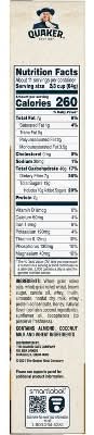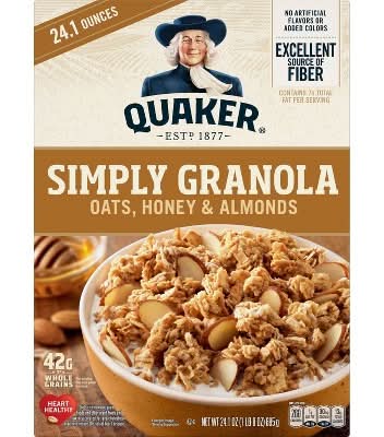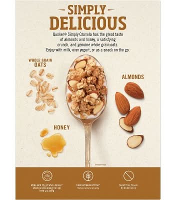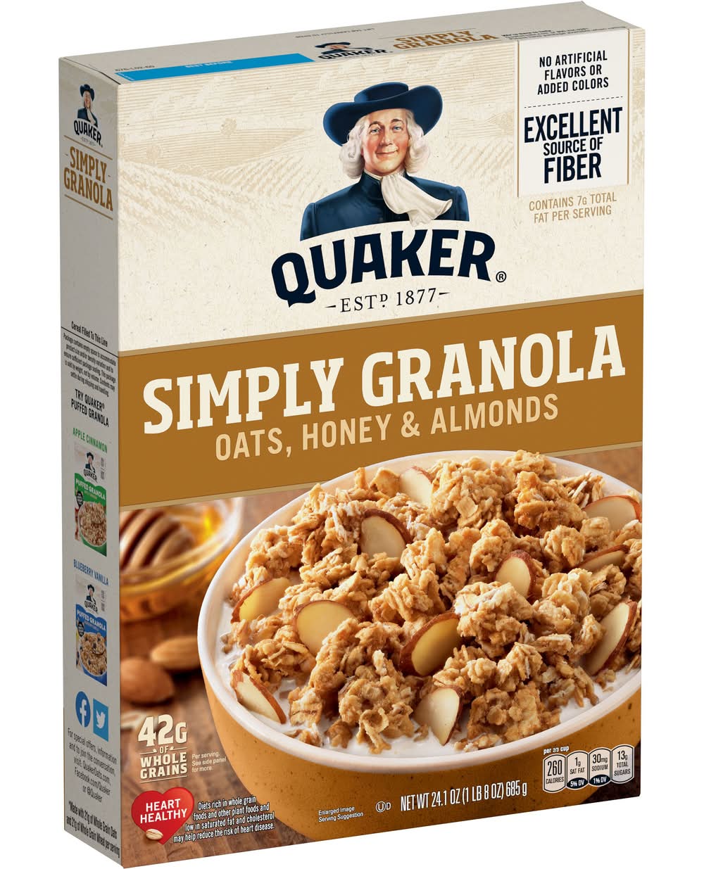 Quaker Simply Granola Oats Honey & Almonds is a granola blend that includes whole grain oats, a touch of honey, and slivers of almonds. It is crafted to provide a satisfying crunch and can be enjoyed with milk, yogurt, or straight from the box as a snack. This granola is suitable for breakfast or as a snack throughout the day. • Flavor: Oats-honey & almonds • The Quaker Oats Company, Chicago, IL, 60604-9003