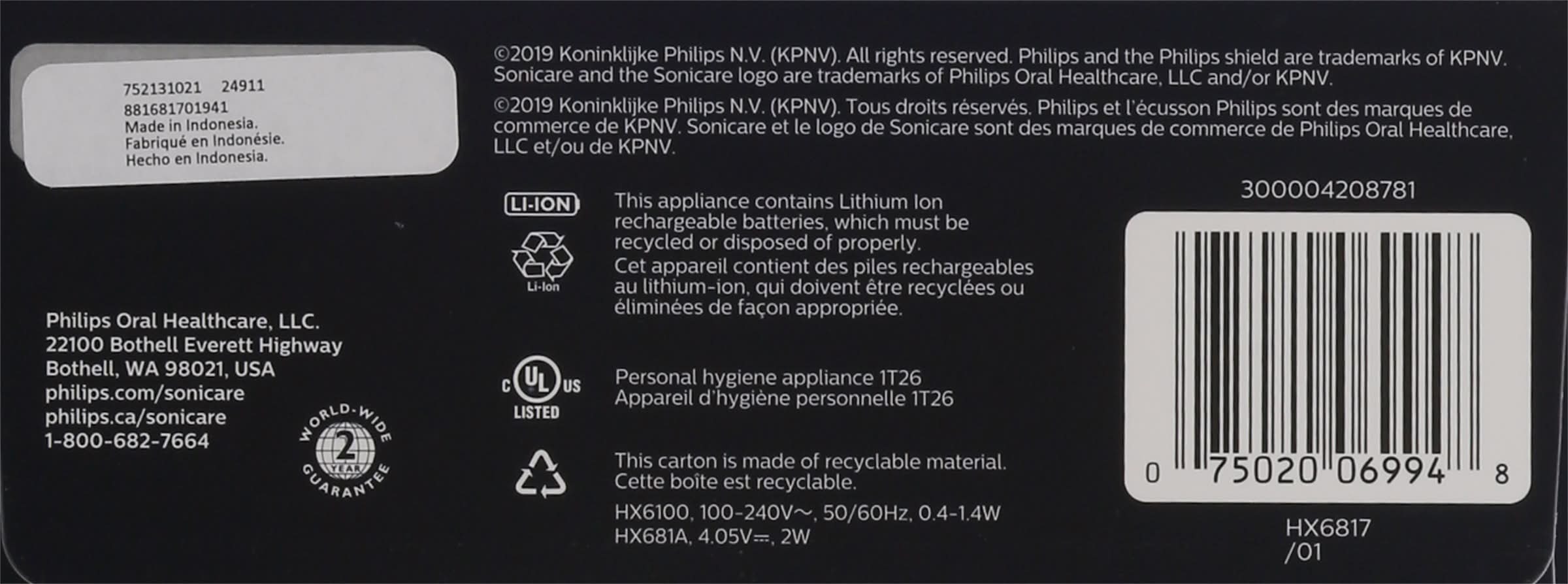 Power Toothbrush • Philips Oral Healthcare, LLC, Bothell, WA, 98021 • Packaging: Reusable