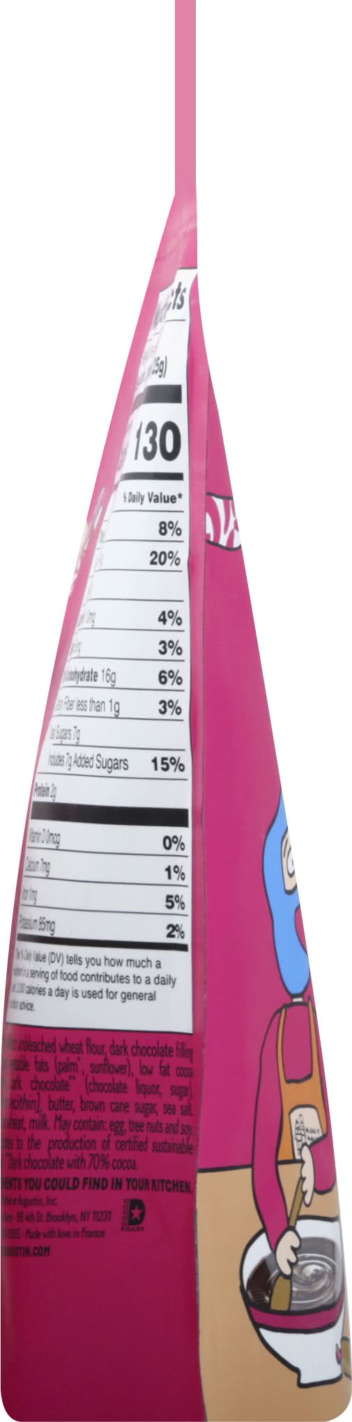 Ingredients: Unbleached Wheat Flour, Dark Chocolate Filling [Sugar, Vegetable Fats (Palm (Contributes to the Production of Certified Sustainable Palm Oil), Sunflower), Low Fat Cocoa Powder, Dark Chocolate (Dark Chocolate with 70% Cocoa)) (Chocolate Liquor Sugar), Sunflower Lecithin], Butter, Brown Cane Sugar, Sea Salt Contains: Wheat, Milk, Eggs, Tree Nuts, Soybeans