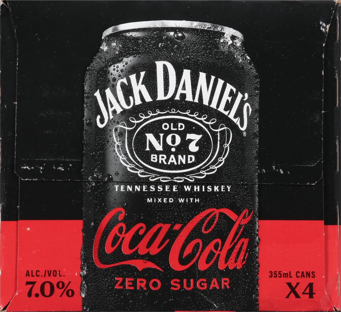 Enjoy a classic whiskey cocktail with the convenience of a canned beverage. Jack Daniel's Tennessee Whiskey and Coca-Cola Zero Sugar Soda combine for a ready-to-drink cocktail that captures the smooth notes of Jack Daniel's balanced with the refreshing, sugar-free taste of Coca-Cola. Each 355ml can offers a perfectly mixed drink with an enjoyable taste experience. Alcohol by volume: 7%