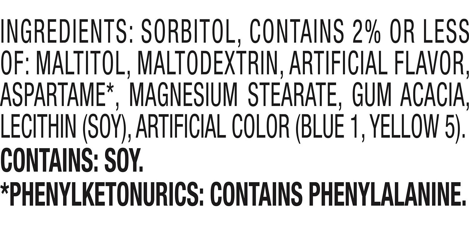Ingredients: SORBITOL, CONTAINS 2% OR LESS OF: MALTITOL, MALTODEXTRIN, ARTIFICIAL FLAVOR, ASPARTAME*, MAGNESIUM STEARATE, GUM ACACIA, LECITHIN (SOY), ARTIFICIAL COLOR (BLUE 1, YELLOW 5). Contains: Soybeans