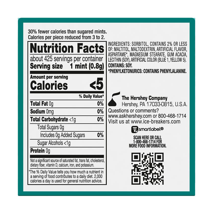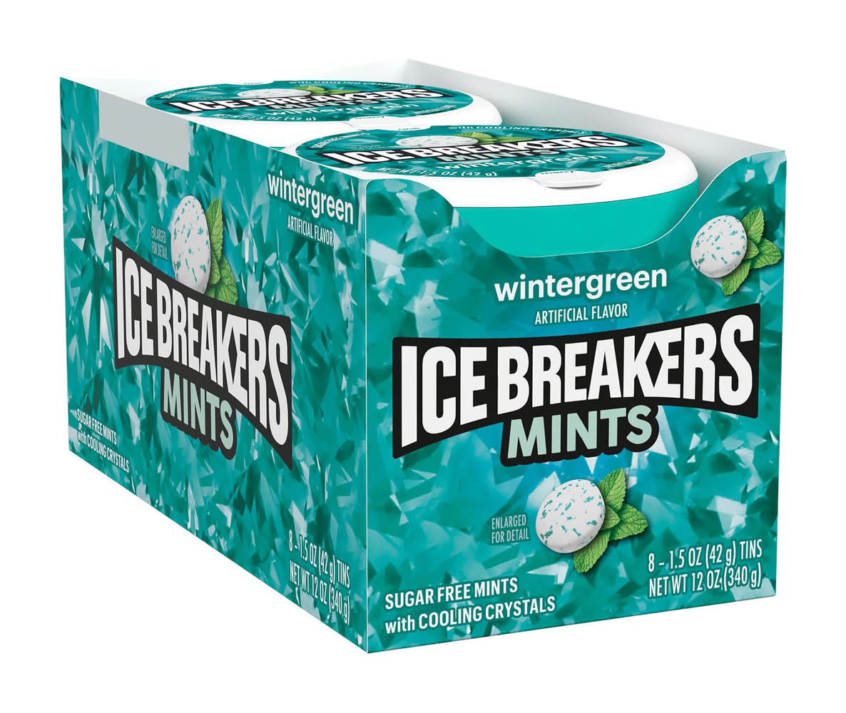 ICE BREAKERS Wintergreen Sugar Free Mints Tins, 1.5 oz (8 Count) • Brand: Ice breakers • Number of servings: 425 • Packaging: Reusable