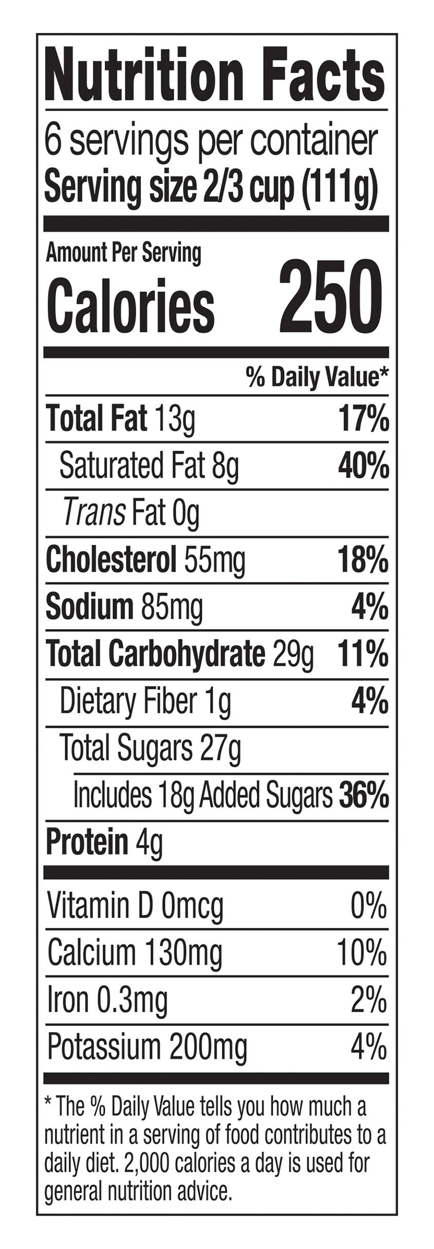 Cream, Milk, Sugar, Golden Raisins (Contains Sulfites), Cherries, Dark Rum, Corn Syrup, Diced Peaches, Diced Pineapple, Clarified Pineapple Juice, Water, Guar Gum, Salt, Mono & Diglycerides, Polysorbate 80, Carrageenan, Natural & Artificial Flavors, Locust Bean Gum, Potassium Phosphate, Cellulose Gum, Citric Acid and Red 40 Contains: Milk, Corn, Sulfites Additives: None