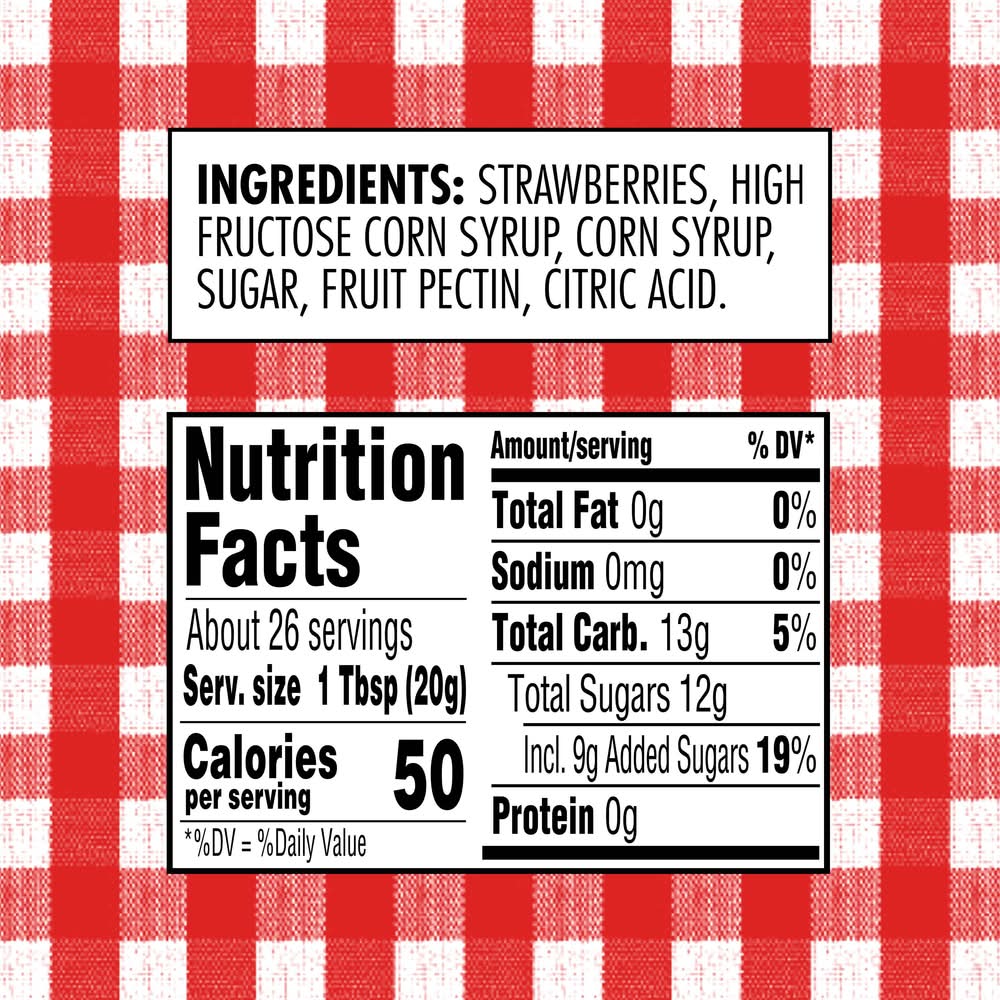Ingredients: Strawberries, High Fructose Corn Syrup, Corn Syrup, Sugar, Fruit Pectin, Citric Acid.
