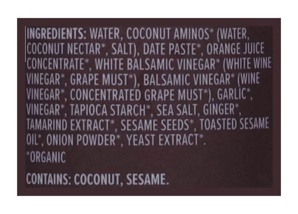 Ingredients: Water, Coconut Aminos* (Water, Organic Coconut Nectar*, Salt), Date Paste*, Orange Juice Concentrate*, White Balsamic Vinegar* (White Wine Vinegar*, Grape Must*), Balsamic Vinegar* (Wine M Non Vinegar*, Concentrated Grape Must*), Garlic*, Gmc Project Vinegar*, Tapioca Starch*, Sea Salt, Ginger* Verified Tamarind Extract*, Sesame Seeds*, Toasted Sesame Keto Oil*, Onion Powder*, Yeast Extract *. *Organic Contains: Tree Nuts, Coconuts, Sesame