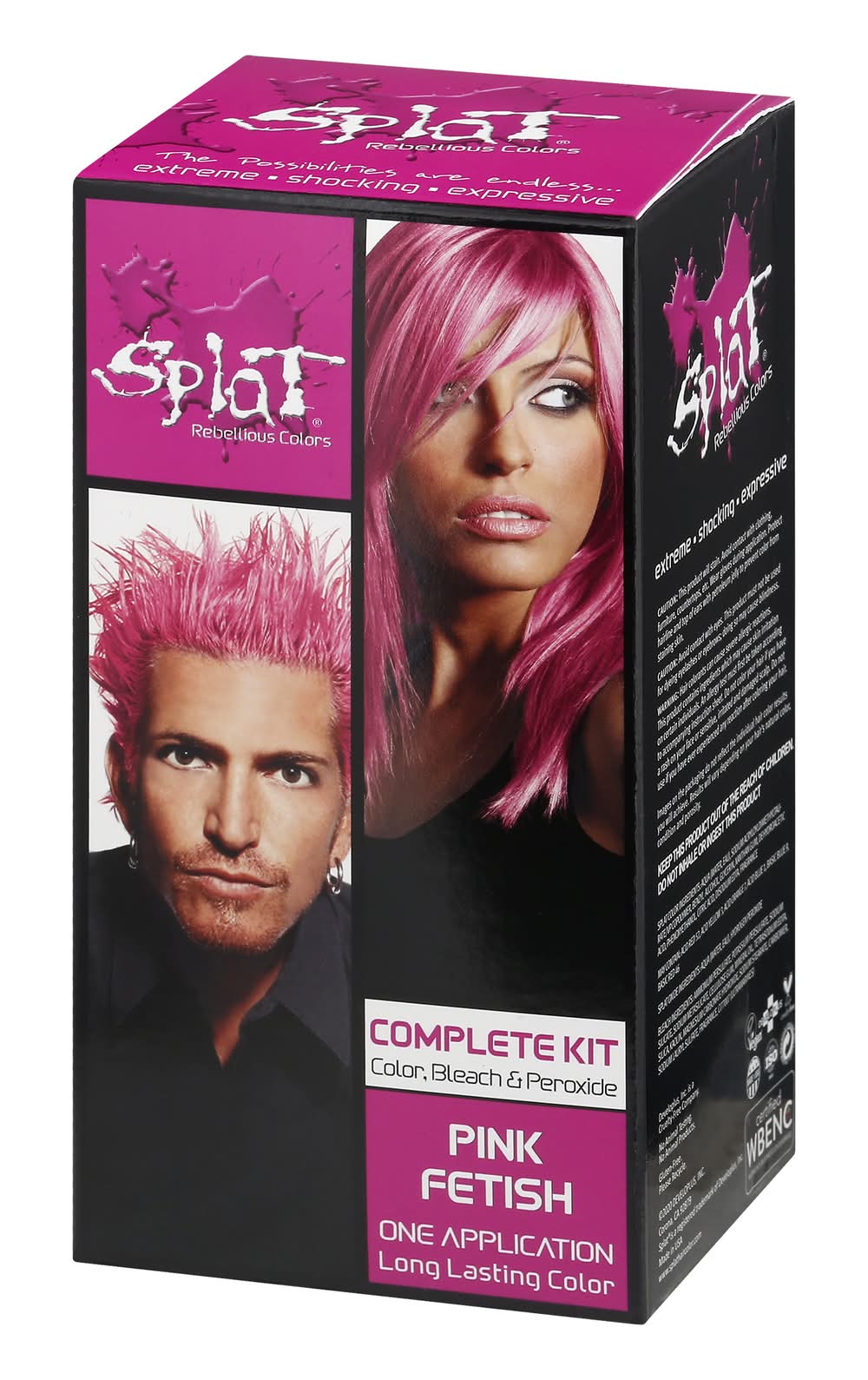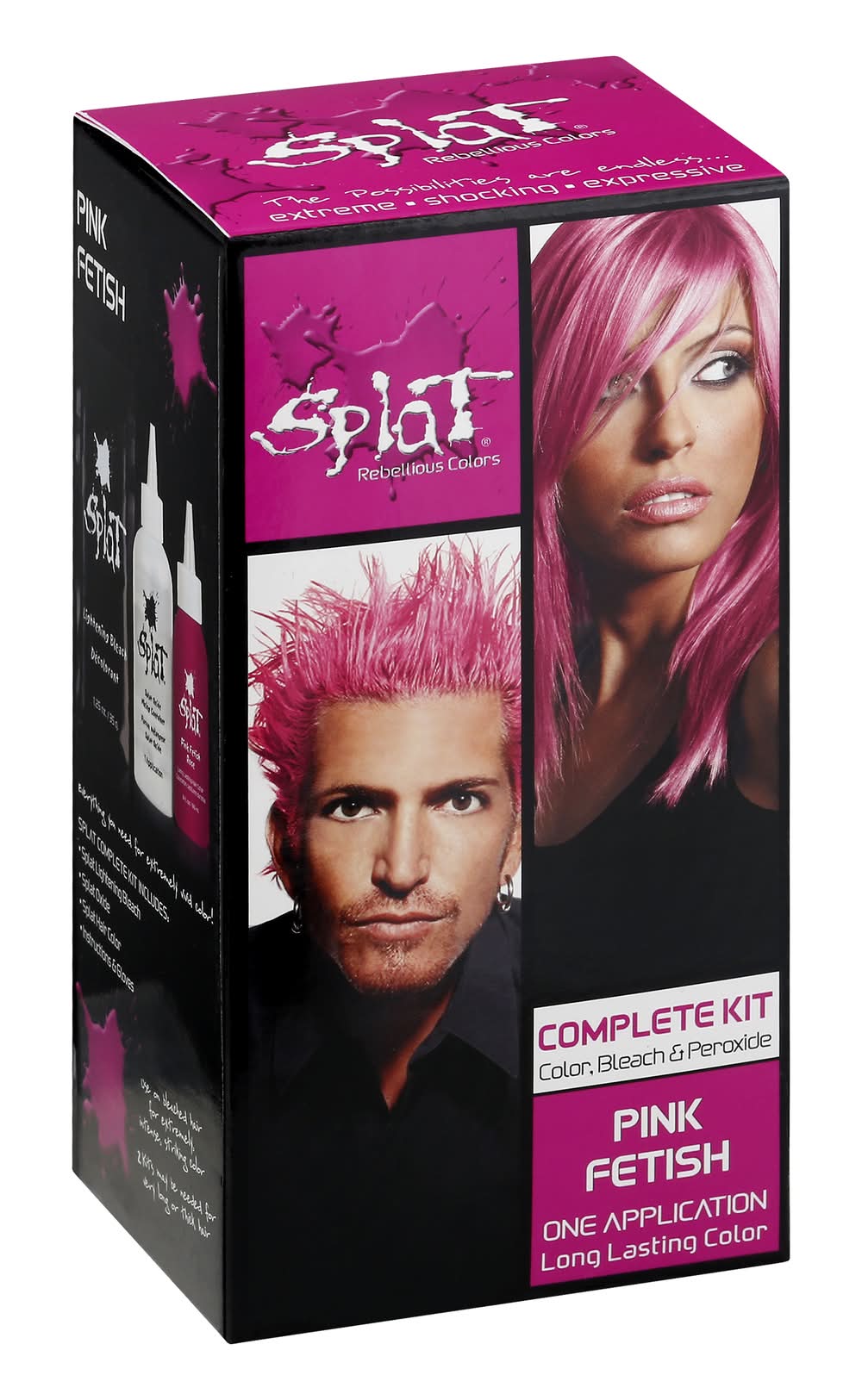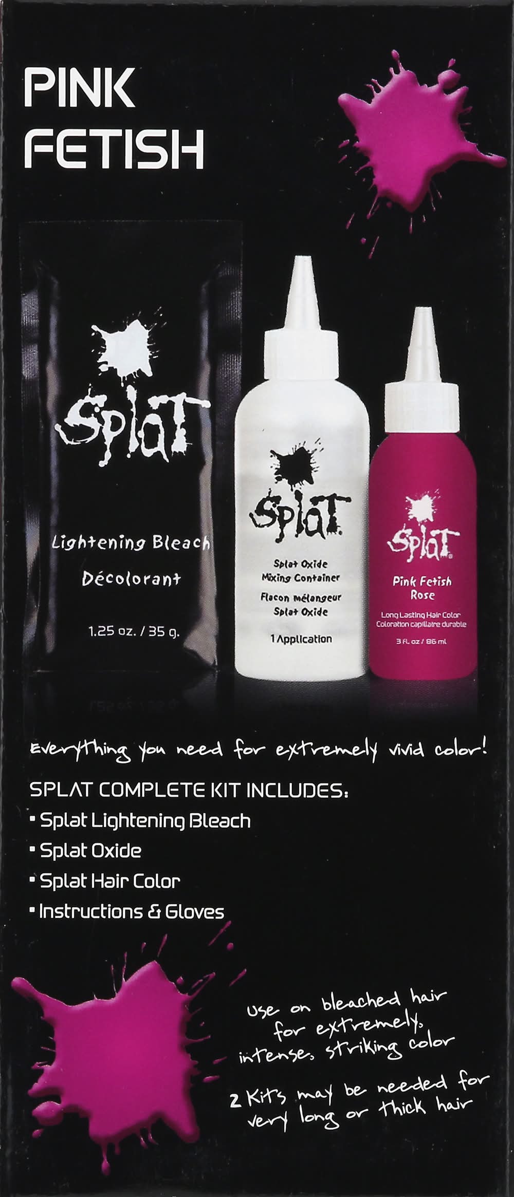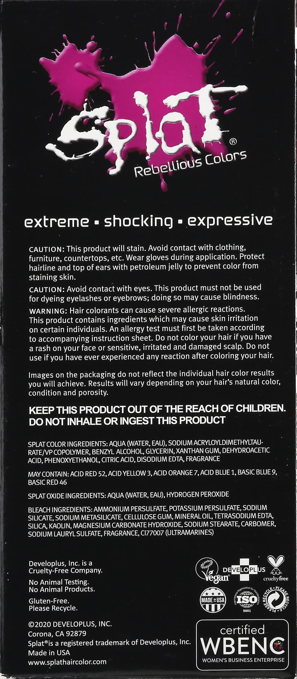 Vegan. Gluten free. Color. Bleach & peroxide. One application. Long lasting color. Splat rebellious colors. The possibilities are endless - extreme, shocking, expressive. New: 30 wash naturals; 30 wash original kit; 30 wash no bleach. 10 wash no bleach. 1 wash halo spray. Lightening bleach. Splat oxide, mixing container. Splat pink fetish. Long lasting hair color. Everything you need for extremely vivid color! Splat Complete Kit Includes: Splat lightening bleach. Splat oxide. Splat hair color. Instructions & gloves. Use on bleach hair for extremely, intense, striking color. 2 kits may be needed very long or thick hair. GMP: Good Manufacturing Practice. ISO. developlus.com. Find all products (atFor more information go to:Certified WBENC: Women's Business Enterprise. Cruelty free. Developlus, Inc. is a cruelty-free company. No animal testing. No animal products. Please recycle. Made in USA. • Size: 1 CT • Developlus, Inc., Corona, CA, 92879 • Packaging: Reusable