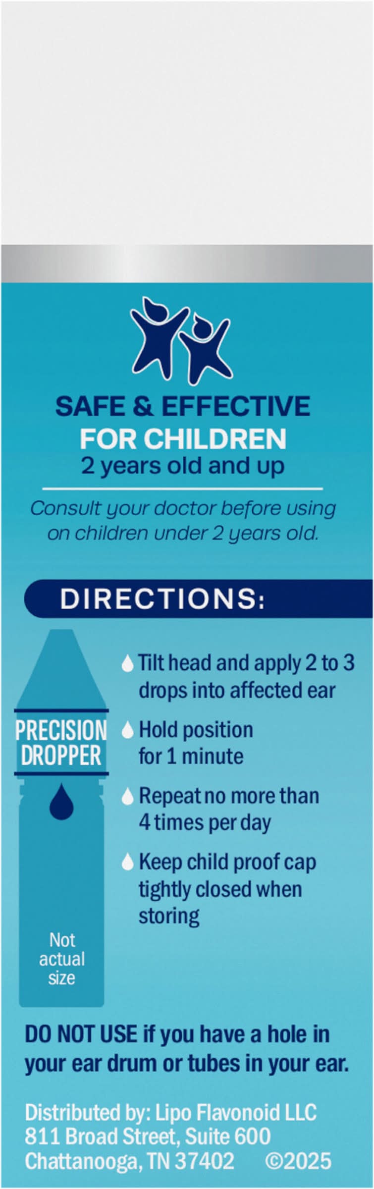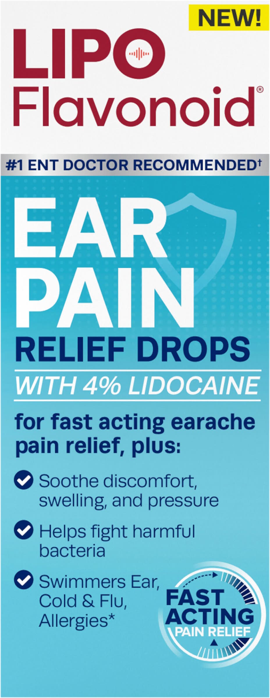 New Lipo Flavonoid Ear Pain Relief Drops provides fast acting soothing relief from earaches, swelling, discomfort, and pressure, with an enhanced 4% Lidocaine pain relief formula. This trusted ear care solution also helps to dry water-clogged ears, gently flush ear wax and debris, and combat harmful bacteria. Safe and effective for both children and adults, this product is recommended by ENT doctors as the top choice for ear pain relief. Maximum Strength Pain Relief: Contains 4% lidocaine – the maximum strength available without a prescription for fast, powerful, and temporary ear pain relief. Fast Acting: begins working on contact for fast acting relief from common ear pain symptoms like aching, throbbing, and discomfort Enhanced Formula: also helps fight harmful bacteria, dries and relieves water-clogged ears, and helps gently flush ear wax and debris #1 ENT Doctor Recommended: Trusted by healthcare professionals for its precision and efficacy in relieving ear pain. Expertly Formulated: with 60 years of ear health expertise Lipo Flavonoid’s new Ear Pain Relief Drops helps soothe discomfort, swelling, and pressure Safe for Children: Suitable for children 2 years and older.