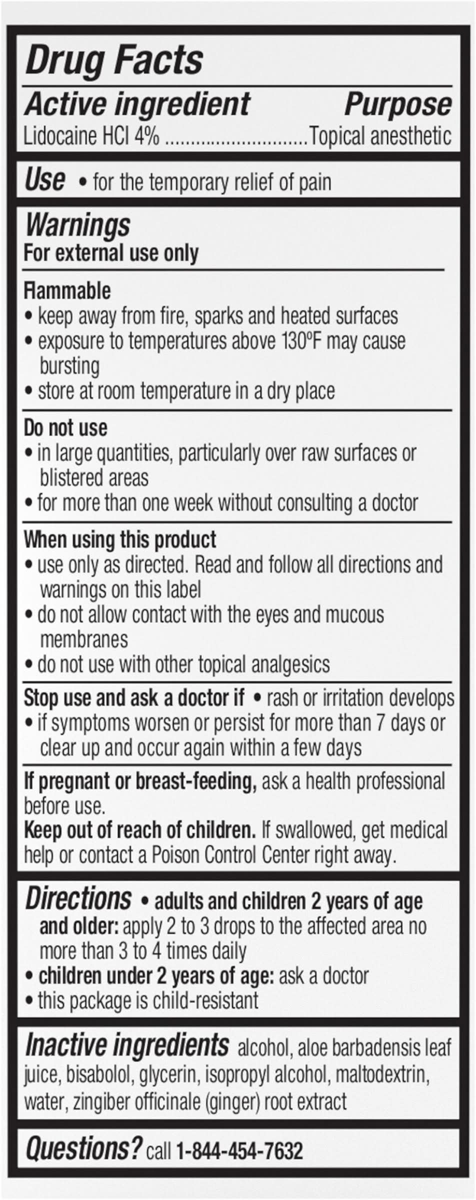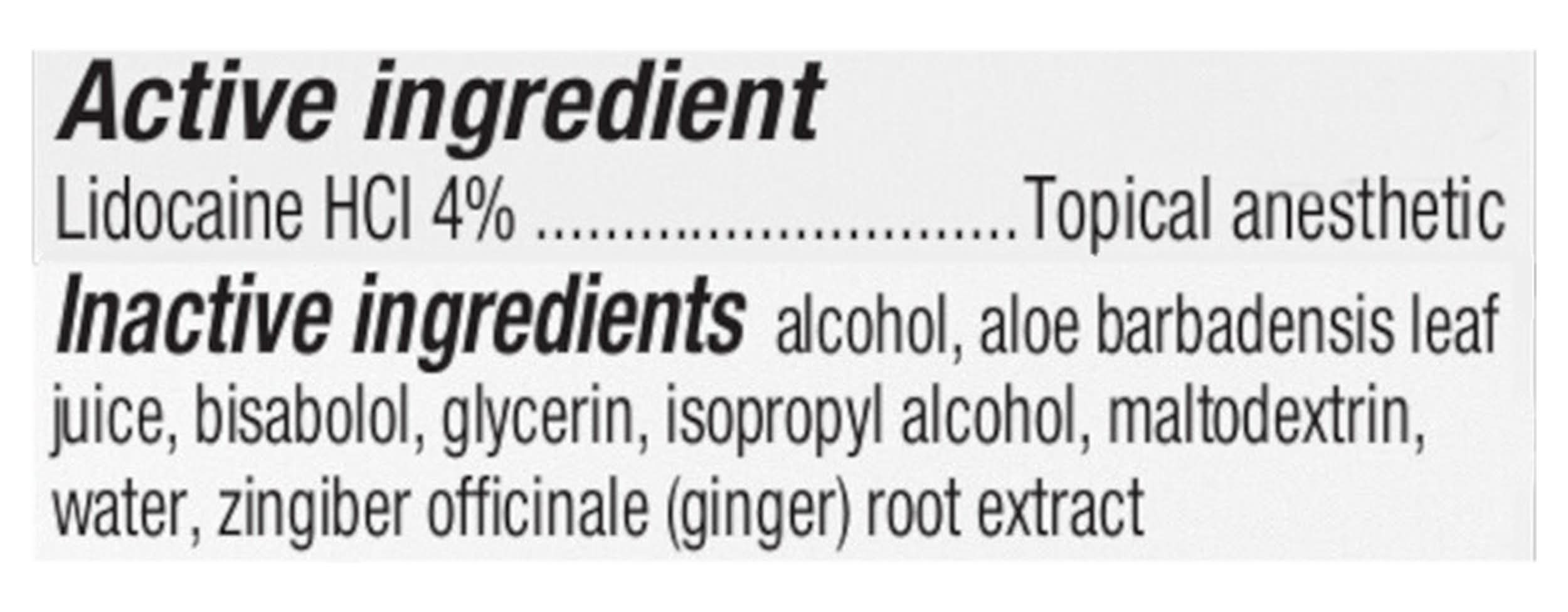 Ingredients: Active Ingredients: Lidocaine HCI (4 %), Topical Analgesic. Inactive Ingredients: Alcohol, Aloe Barbadensis Leaf Juice, Bisabolol, Glycerin, Isopropyl Alcohol, Maltodextrin, Water, Zingiber Officinale (Ginger) Root Extract