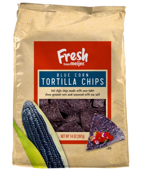 Fresh From Meijer Blue Corn Tortilla Chips are characterized by their crunchy texture and pronounced salty flavor, making them a fitting choice for pairing with salsa or con queso dips. Marketed as an ideal snack for hosting, these blue corn tortilla chips cater well to gatherings.