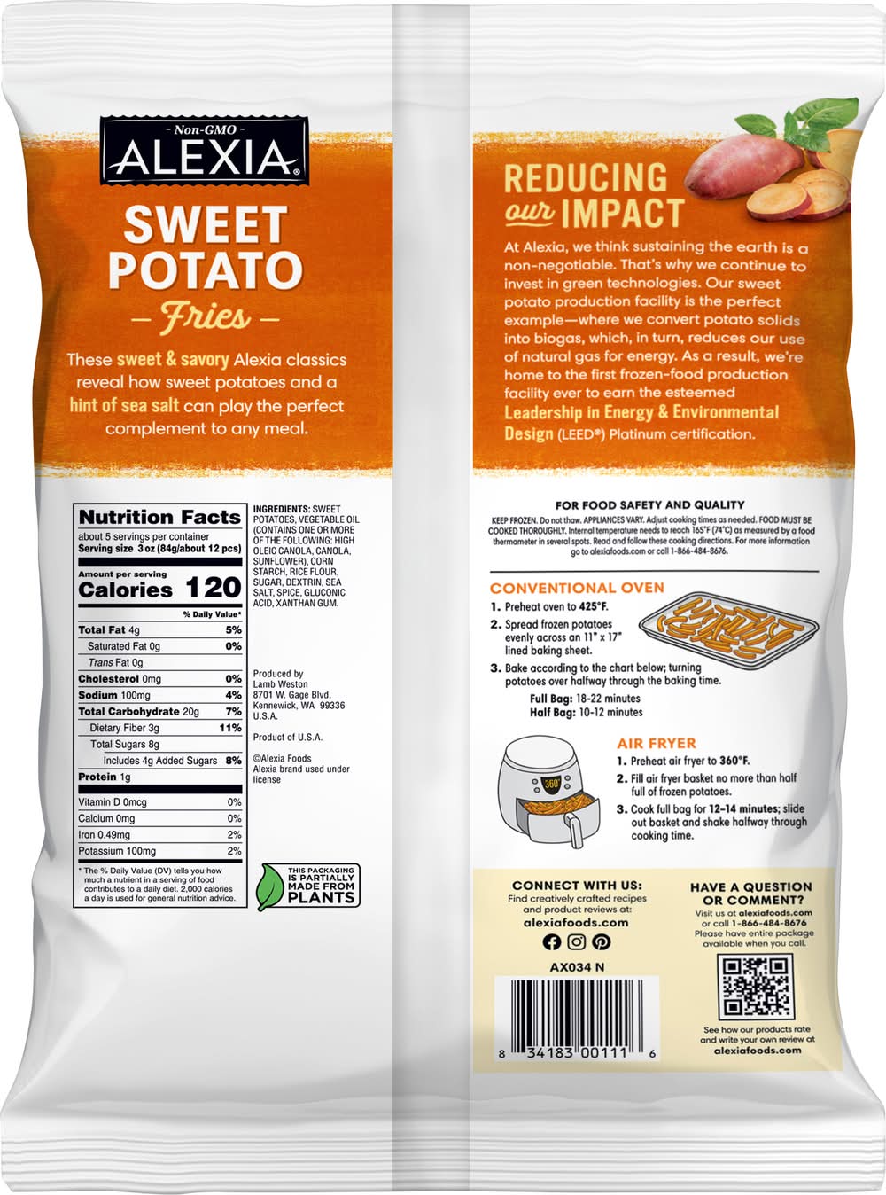 Directions for use: Bake: Preheat oven to 425 degrees F. Full Bag: 18 to 22 minutes. Half Bag: 10 to 12 minutes. Arrange frozen potatoes in a single layer on an 11 inch x 17 inch baking sheet. Bake according to instructions above to desired color and crispness, stirring halfway through cooking time. For Food Safety and Quality: Keep frozen. Do not thaw. Appliances vary. Adjust cooking times as needed. Food must be cooked thoroughly. Internal temperature need to reach 165 degrees F as measured by a food thermometer in several spots. Read and follow these cooking directions. For more information go to alexiafoods.com or call 1-866-484-8676. Keep frozen. Storage recommendation: keep frozen.