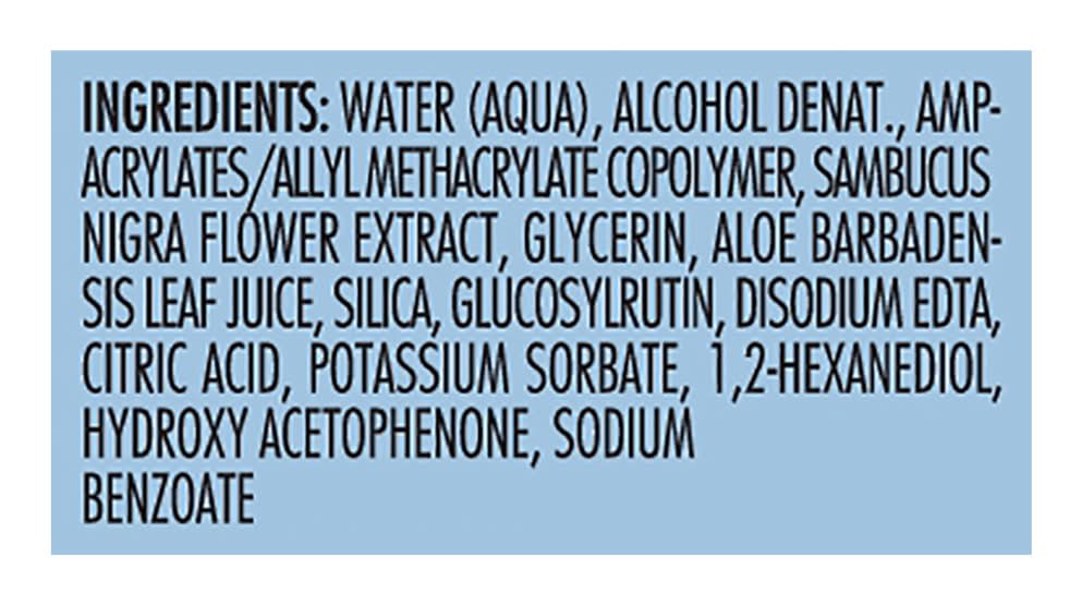 Ingredients: Water (Aqua), Alcohol Denat, Ampacrylates/Allyl Methacrylate Copolymer, Sambucus Nigra Flower Extract, Glycerin, Aloe Barbadensis Leaf Juice, Silica, Glucosylrutin, Disodium EDTA, Citric Acid, Potassium Sorbate, 1.2-Hexanediol, Hydroxy Acetophenone, Sodium Benzoate