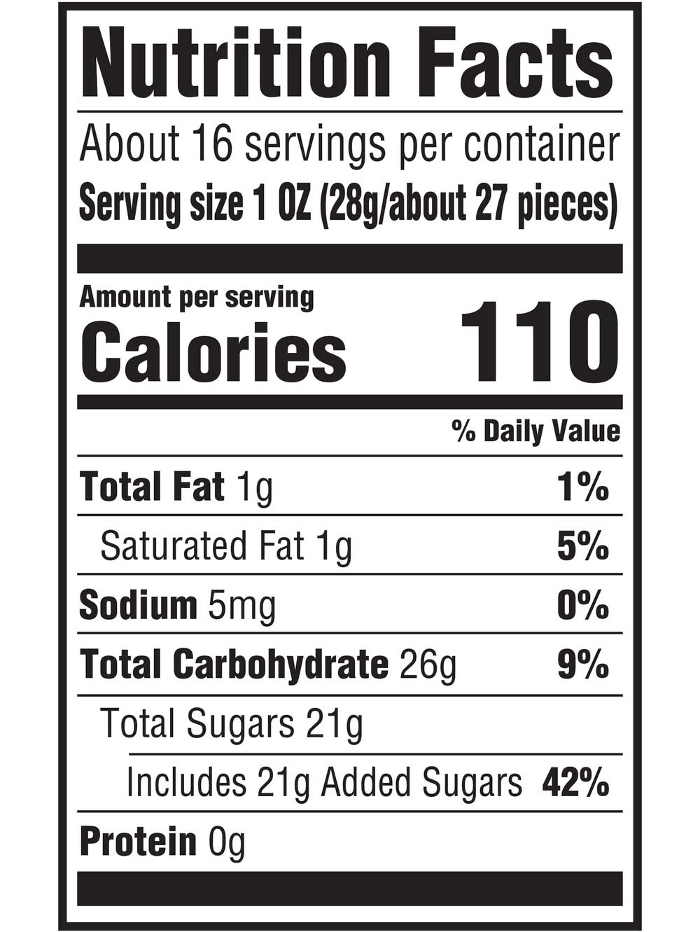 Sugar, Corn Syrup, Hydrogenated Palm Kernel Oil; Less than 2% of: Citric Acid, Tapioca Dextrin, Modified Corn Starch, Natural and Artificial Flavors, Sodium Citrate, Colors (Yellow 5 Lake, Yellow 6 Lake, Blue 1 Lake, Red 40 Lake, Titanium Dioxide, Yellow 6, Red 40, Yellow 5, Blue 1), Carnauba Wax. Contains: 'Free From Gluten'