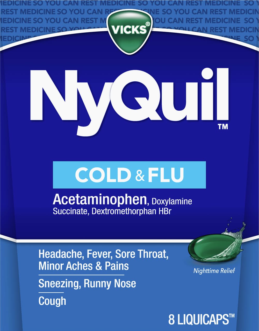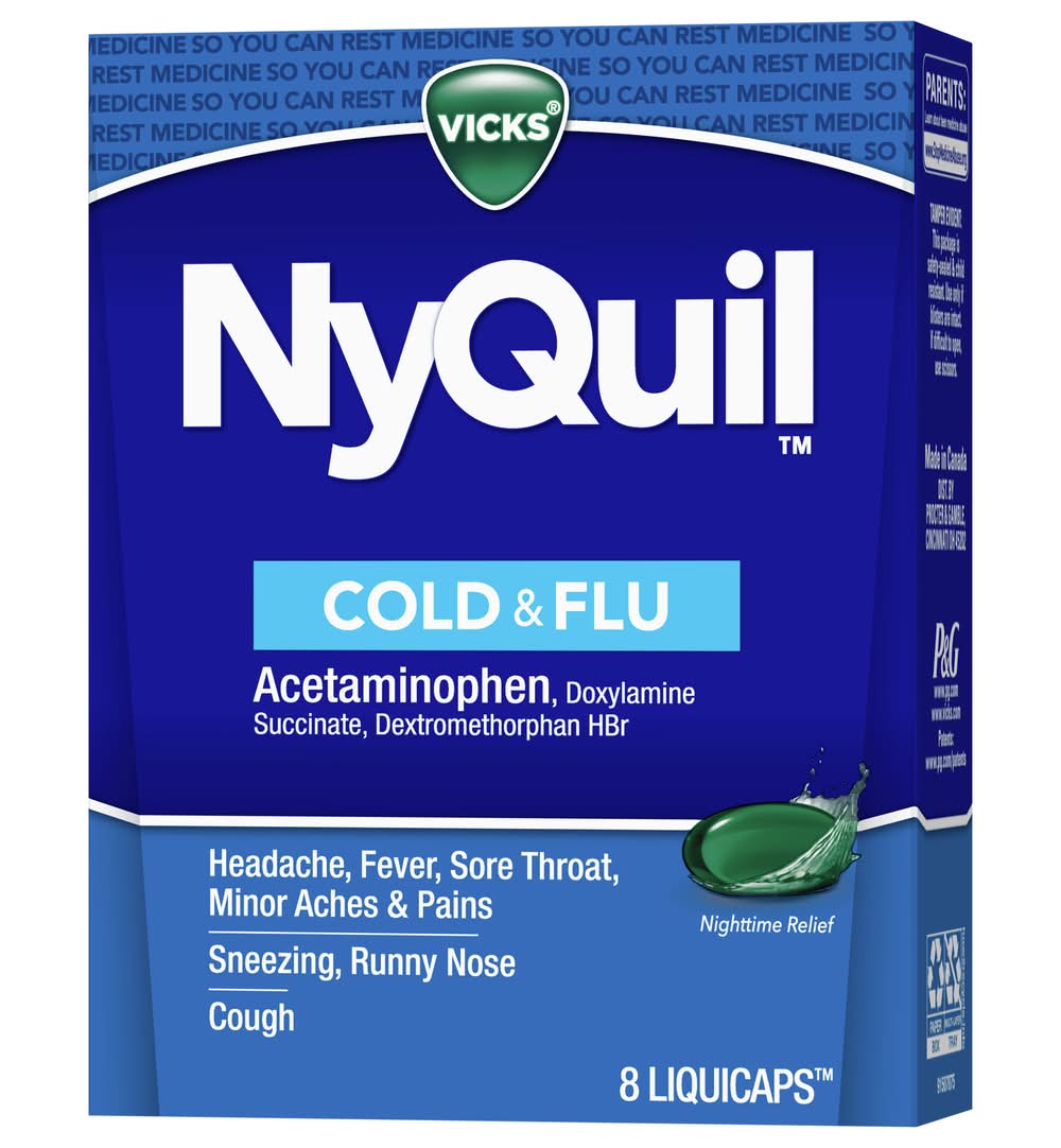 Acetaminophen, doxylamine succinate, dextromethorphan HBr. Headache, fever, sore throat, minor aches & pains. Sneezing, Runny nose. Cough. Alcohol 10%. The nighttime, sniffling, sneezing, coughing, aching, stuffy head, fever, best sleep with a cold, medicine. Same power less plastic (vs. the previous Nyquil Bottle). how2recycle.info. www.stopmedicineabuse.org. www.vicks.com. www.pg.com. Questions? 1-800-362-1683. Parents: Learn about teen medicine abuse. www.stopmedicineabuse.org. Made in Canada.