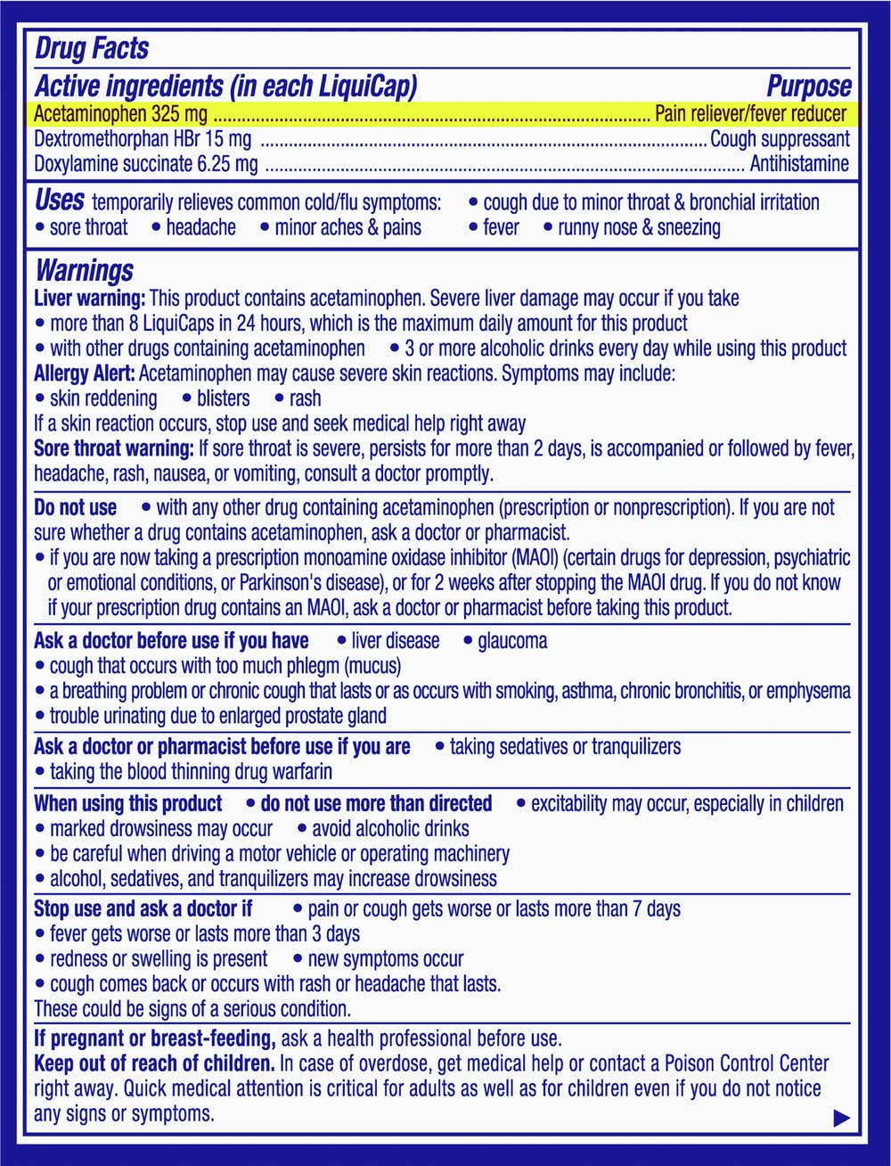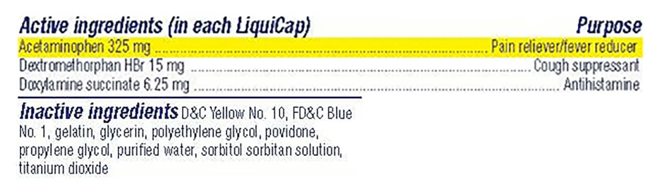 Ingredients: Active Ingredients: Acetaminophen (325 mg), Pain Reliever/Fever Reducer; Dextromethorphan HBR (15 mg), Cough Suppressant & Topical Analgesic; Doxylamine Succinate (6.25 mg), Antihistamine. Inactive Ingredients: D&C Yellow No. 10, FD&C Blue No. 1, Gelatin, Glycerin, Polyethylene Glycol, Povidone, Propylene Glycol, Purified Water, Sorbitol Sorbitan Solution, Titanium Dioxide Contains: Alcohol, gluten