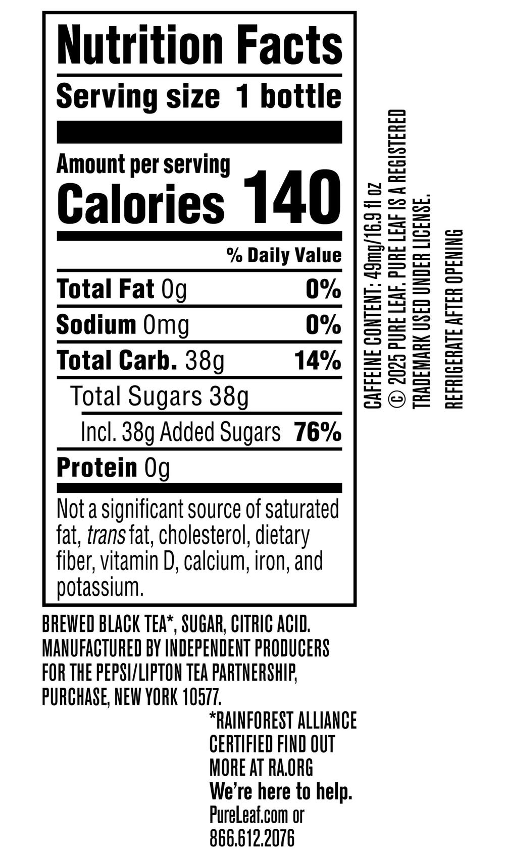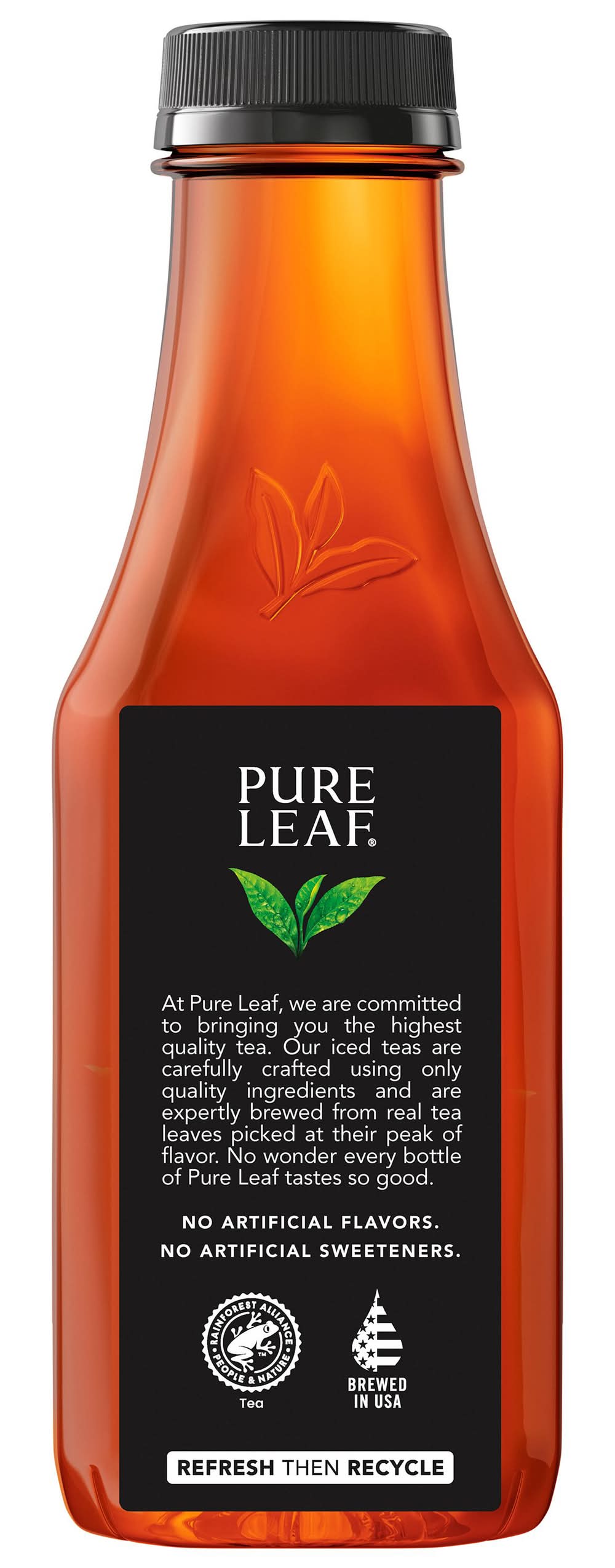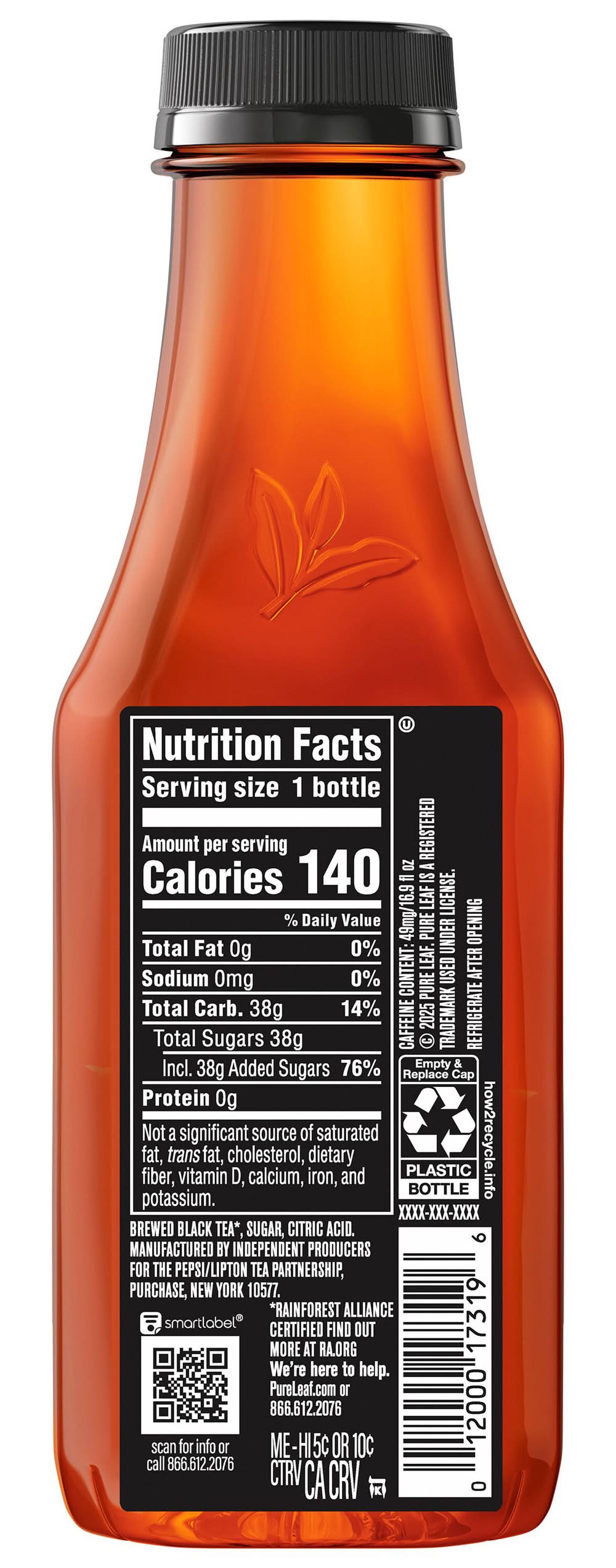 Real Brewed Iced Tea offers a sweet taste in bottle. Made without artificial flavors or sweeteners, the tea is brewed in the USA. The bottle is created using 50% recycled content, aligning with efforts to support a sustainable tea industry. The product also carries the Rainforest Alliance certification, emphasizing a commitment to both people and nature. • Flavor: • Size: 18.5 OZ • Pepsi/Lipton Tea Partnership, Purchase,NY,10577 • Packaging: Reusable