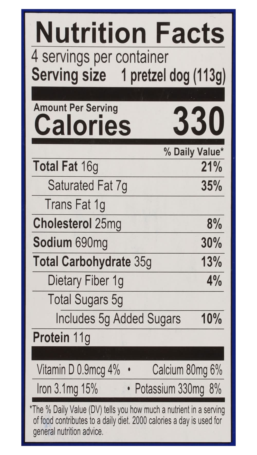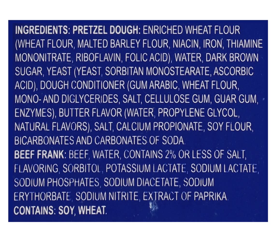 Ingredients: Pretzel Dough: Enriched Wheat Flour (Wheat Flour, Malted Barley Flour, Niacin, Iron, Thiamine Mononitrate, Riboflavin, Folic Acid), Water, Dark Brown Sugar, Yeast (Yeast, Sorbitan Monostearate, Ascorbic Acid), Dough Conditioner (Gum Arabic, Wheat Flour, Mono- and Diglycerides, Salt, Cellulose Gum, Guar Gum, Enzymes), Butter Flavor (Water, Propylene Glycol, Natural Flavors), Salt, Calcium Propionate, Soy Flour, Bicarbonates and Carbonates of Soda. Beef Frank: Beef, Water, Contains 2% or Less of Salt, Flavoring, Sorbitol, Potassium Lactate, Sodium Lactate, Sodium Phosphates, Sodium Diacetate, Sodium Erythorbate, Sodium Nitrite, Extract of Paprika Contains: Soybeans, Wheat, Barley