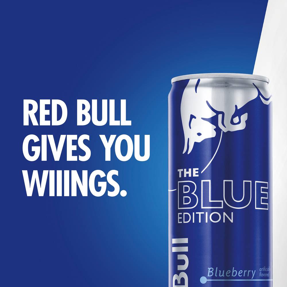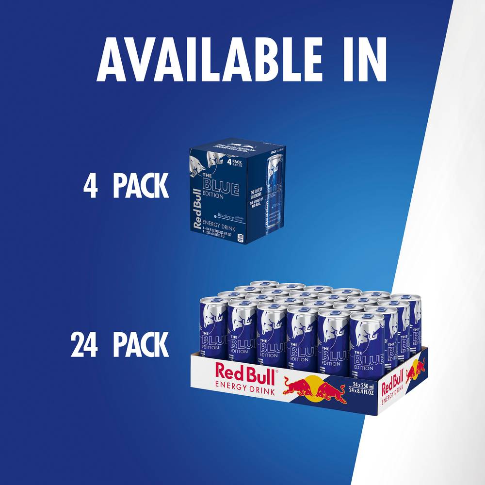 This Red Bull Blue Edition features the fruity taste of Blueberry. This lightly carbonated beverage is enjoyed worldwide by fitness enthusiasts, athletes, gamers, students and travelers. A refreshing can of Red Bull makes an excellent partner for busy, active lifestyles. Each 12 fl oz can contains 114mg of caffeine per serving and 38g of sugar (comparable to sugar levels found in apple juice). It also includes Taurine, an amino acid naturally occurring in the human body, and B-group vitamins B6, B12, Niacin (B3) and Pantothenic Acid (B5). Available in 4-packs, 12-packs, 24-packs and Variety Packs. Comes in aluminum cans that can be recycled over and over. Always check can labels for the most updated product nutritional and ingredient information. Calcium and sugars values declared on labels may vary slightly depending on production locations. Always check can labels for most updated product nutritional and ingredient information. Calcium and sugars values declared on labels may vary slightly depending on production locations. • Flavor: Blueberry • Size: 12 OZ • Red Bull North America, Inc., Santa Monica, CA 90404 • Packaging: Reusable