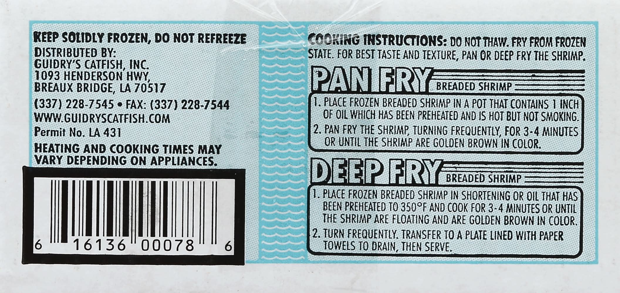 Keep frozen. Keep solidly frozen, do not refreeze. Heating and cooking time may vary depending on appliances. Cooking Instructions: Do not thaw. Fry from frozen state. For best taste and texture, pan or deep dry the shrimp. Pan Fry Breaded Shrimp: 1. Place frozen breaded shrimp in a pot that contains 1 inch of oil which has been preheated and is hot but not smoking. 2. Pan fry the shrimp, turning frequently, for 3-4 minutes or until the shrimp are golden brown in color. Deep Fry Breaded Shrimp: 1. Place frozen shrimp in shortening or oil that has been preheated to 350 degrees F and cook for 3-4 minutes or until the shrimp are floating and are golden brown in color. 2. Turn frequently. Transfer to a plate lined with paper towels to drain, then serve.
