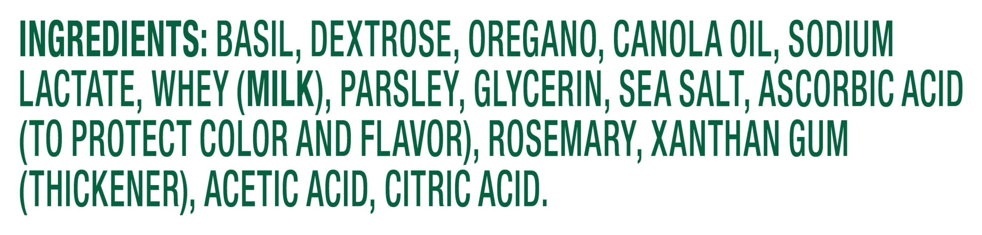 Ingredients: Basil, Dextrose, Oregano, Canola Oil, Sodium Lactate, Whey (Milk), Parsley, Glycerin, Sea Salt, Ascorbic Acid (to Protect Color and Flavor), Rosemary, Xanthan Gum, Acetic Acid, Citric Acid. Contains: milk