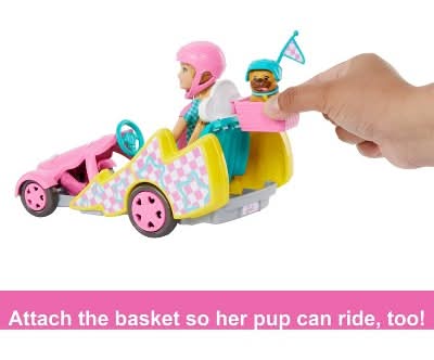 Smoke the tracks with Stacie doll and her Go-Kart! With rolling wheels, checkered deco, a removable flag, and attachable puppy basket this vehicle looks like it zoomed right out of the animated movie, Barbie and Stacie to the Rescue. There's also a sticker sheet so kids can customize their go-kart. Stacie doll wears her racing outfit and is ready to hit the pedal to the metal. Don't forget her helmet (there's one for her pup passenger, too)! Doll cannot stand alone. Colors and decorations may vary.