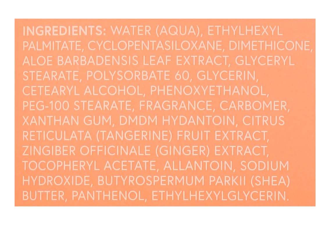 Water (Aqua), Ethylhexyl Palmitate, Cyclopentasiloxane, Dimethicone, Aloe Barbadensis Leaf Extract, Glyceryl Stearate, Polysorbate 60, Glycerin, Cetearyl Alcohol, Phenoxyethanol, PEG-100 Stearate, Fragrance, Carbomer, Xanthan Gum, DMDM Hydantoin, Citrus Reticulata (Tangerine) Fruit Extract, Zingiber Officinale (Ginger) Extract, Tocopheryl Acetate, Allantoin, Sodium Hydroxide, Butyrospermum Parkii (Shea) Butter, Panthenol, Ethylhexylglycerin Contains: None Additives: None