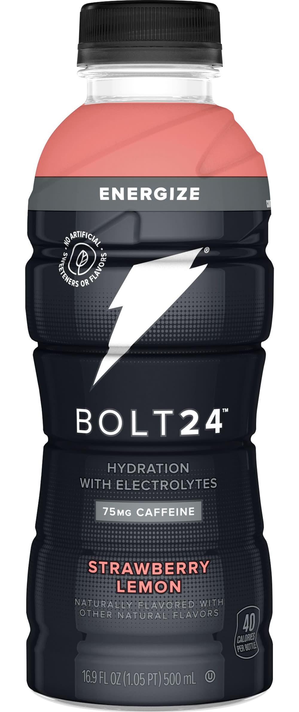 Bolt24 Energize Strawberry Lemon Hydration Drink offers a blend of electrolytes sourced from watermelon and sea salt. Each bottle provides 100% of the daily value of antioxidant vitamins A and C. The drink is made without artificial sweeteners or flavors. It is designed to support hydration needs throughout the day. • Flavor: Strawberry lemon • The Gatorade Co., PO Box 049003,Chicago,IL,60604