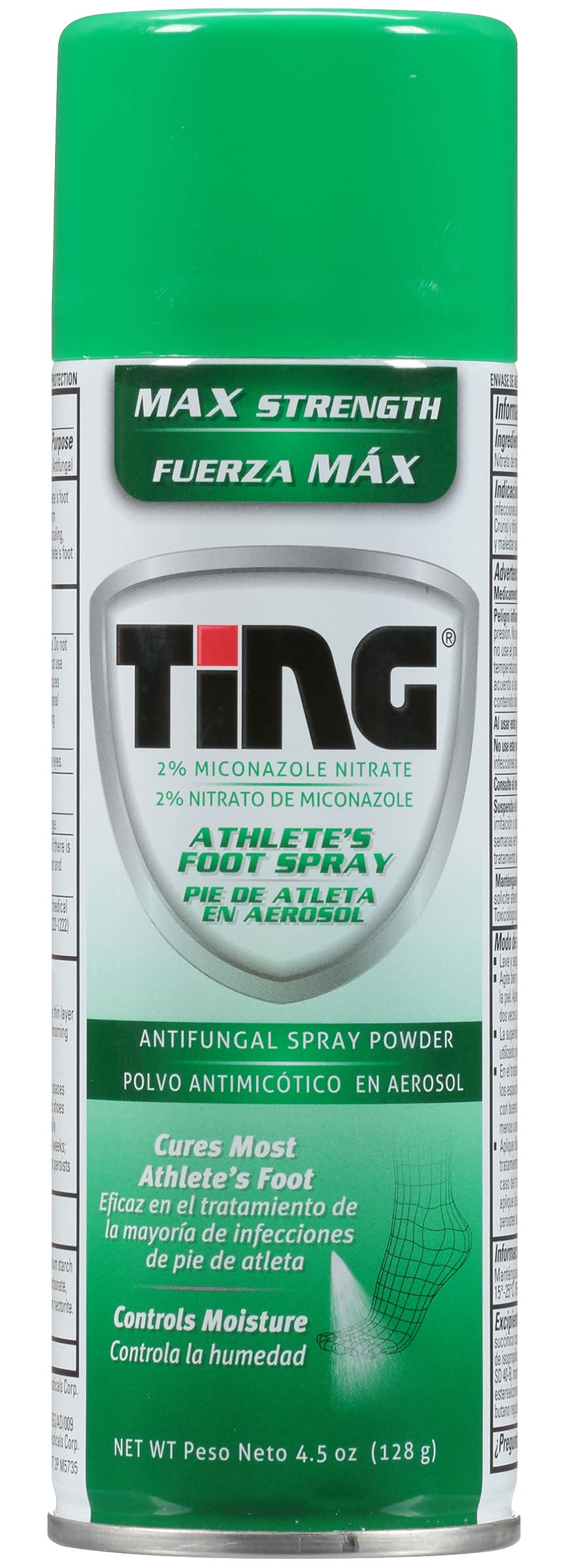 Ting Maximum Strength Antifungal Athlete's Foot Spray Powder contains 2% miconazole nitrate and is formulated to cure most cases of athlete's foot and jock itch. It provides relief from itching and burning sensations. The product is manufactured in India. Insight Pharmaceuticals,