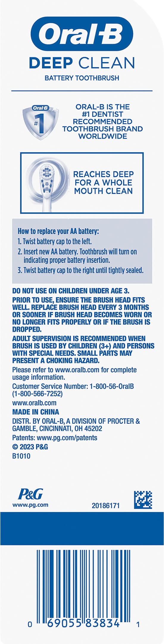 How to replace your aa battery: 1. twist battery cap to the left. 2. insert new aa battery. toothbrush will turn on, indicating proper battery insertion. 3. twist battery cap to the right until tightly sealed. replace brush head every 3 months or sooner if brush head becomes worn or loose due to damage.