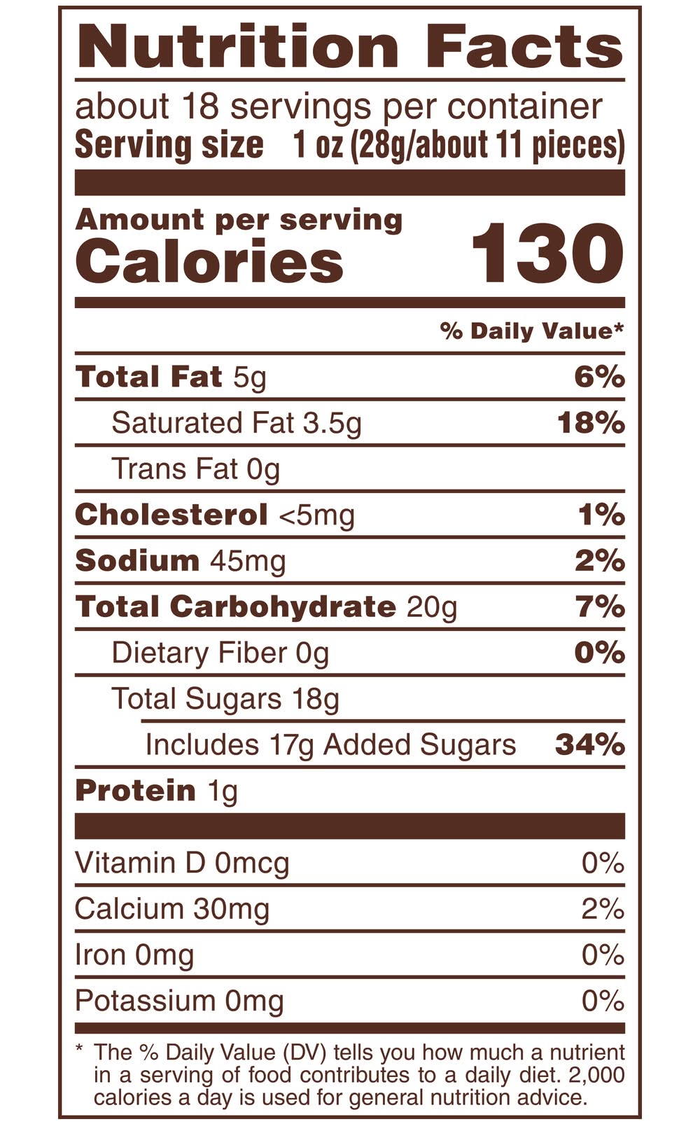 MILK CHOCOLATE (SUGAR, CHOCOLATE, COCOA BUTTER, SKIM MILK, LACTOSE, MILKFAT, SOY LECITHIN, SALT, NATURAL FLAVOR), SUGAR, CORN SYRUP, HYDROGENATED VEGETABLE OIL (COCONUT AND PALM OILS), SKIM MILK, MILKFAT; LESS THAN 2% OF: CORNSTARCH, LACTOSE, DEXTRIN, SALT, COLORS (INCLUDES BLUE 1 LAKE, YELLOW 6, RED 40, YELLOW 5, BLUE 1, YELLOW 6 LAKE, RED 40 LAKE, YELLOW 5 LAKE, BLUE 2 LAKE, BLUE 2), CARNAUBA WAX, CHOCOLATE, ARTIFICIAL FLAVOR, GUM ACACIA. Contains: CONTAINS MILK AND SOY. MAY CONTAIN PEANUTS.