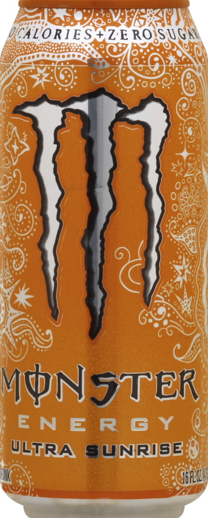 Zero calories + zero sugar. Get up, get out, go for it! Ultra Sunrise is dedicated to those who sacrifice sleep for passion: catching waves at dawn patrol, up on the bike when the morning dew gives the dirt more grip, or the first pass on that glassy lake kicking off an epic wake session. Ultra Sunrise will get you started but is great anytime: light, crisp, and refreshing with a flavor all its own. Packed with a full load of our Monster energy blend to keep the fire burning all day long. After all it's always sunrise somewhere. Unleash the ultra beast! Facebook. Instagram. Twitter. YouTube. Monster Energy Blend: taurine, Panax ginseng extract, L-carnitine, caffeine, guarana extract, Glucuronolactone, inositol. Caffeine from All Sources: 75 mg per 8 fl oz serving (150 mg per can). • Flavor: Ultra sunrise • Size: 16 OZ • Monster Beverage, 1 Monster Way Corona, CA 92879