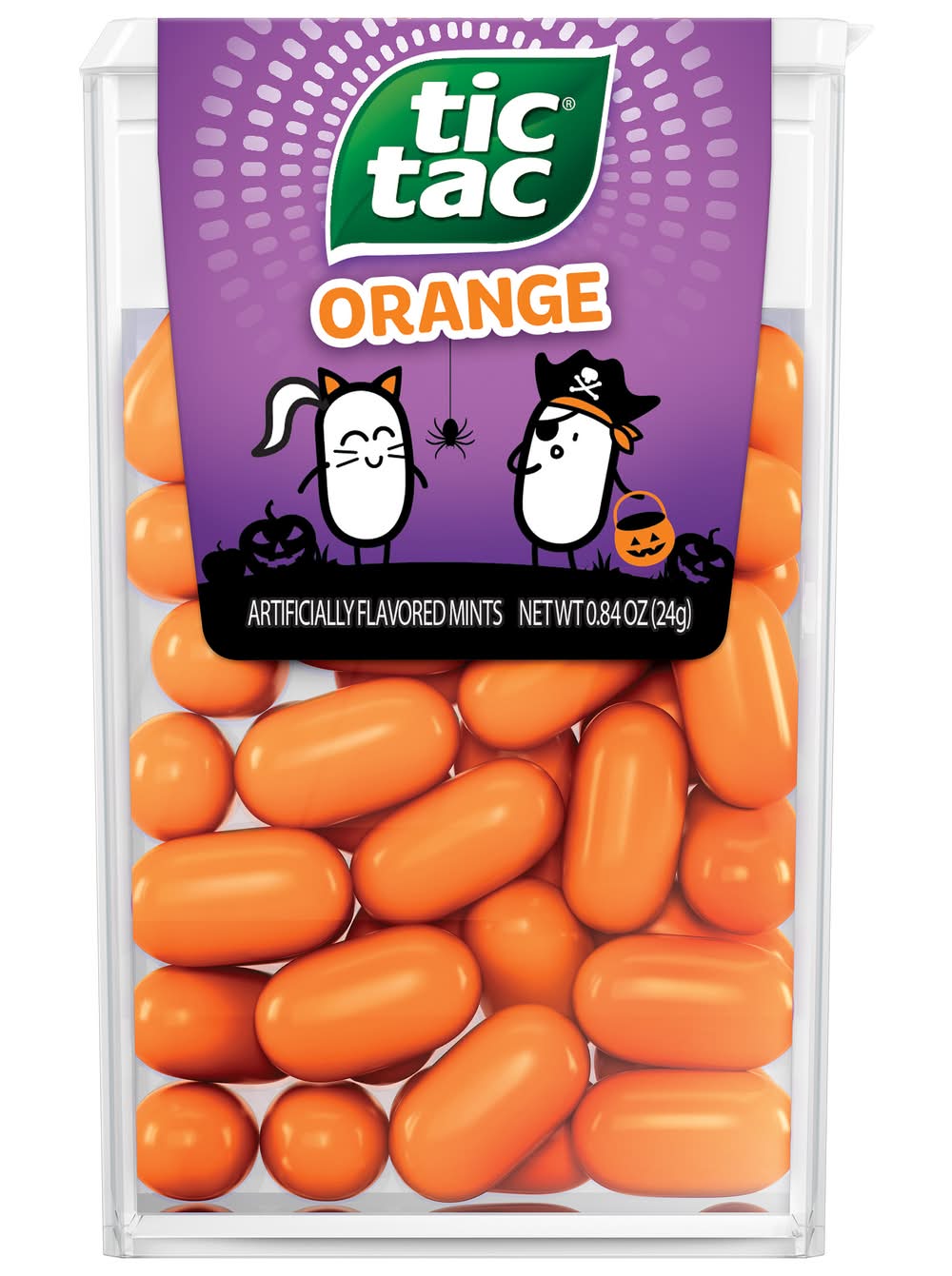 Celebrate the spooky season with Tic Tac Fresh Mints in Orange flavor, packaged in a fun, Halloween-themed container. These classic orange-flavored mints offer a burst of refreshing citrus, making them perfect for enjoying during a Halloween party. With 0.84 oz sugar-free mints in each pack, they are great for sharing at parties, handing out as trick or treat candy, or keeping handy for a quick refresh. Compact and portable, they fit perfectly into your pocket, purse, or bag, ensuring you're always prepared for fresh breath on the go. Whether you're enjoying them yourself or sharing the festive fun with friends and family, Tic Tac Orange Mints add a flavorful twist to your Halloween trick or treat. • Flavor: Orange • Size: 1 CT