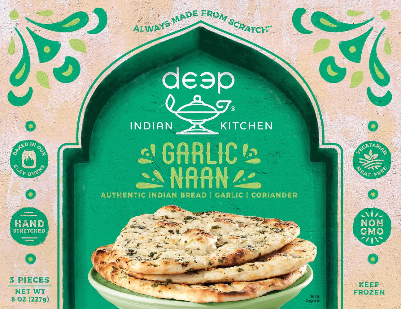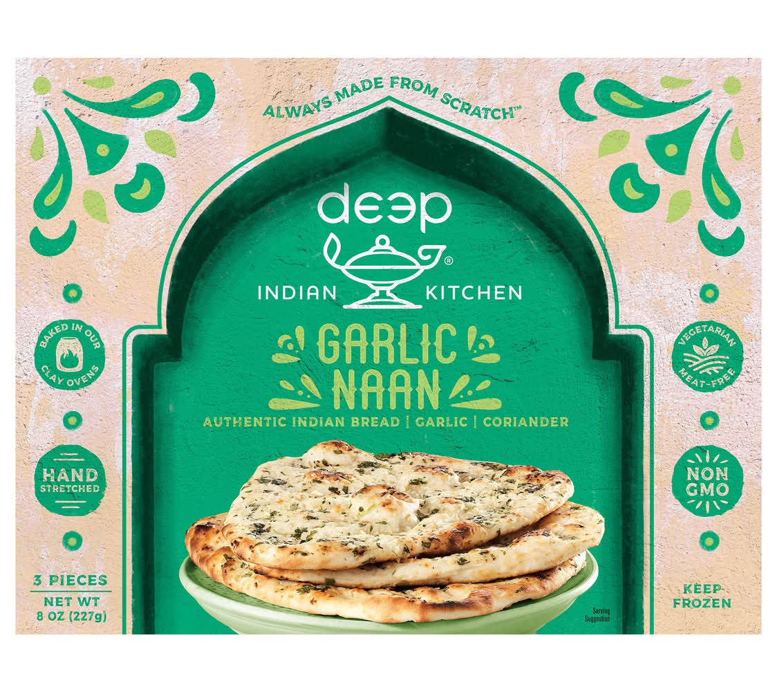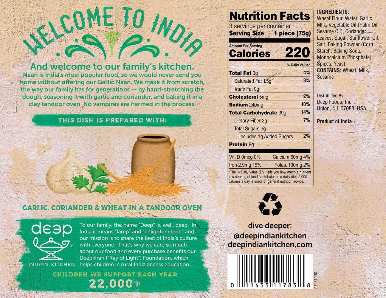 Vegetarian. Meat-free. Non GMO. Always made from scratch. Baked in our clay ovens. Hand stretched. Authentic Indian bread, garlic, coriander. Welcome to India and welcome to our family’s kitchen. Naan is India’s most popular food, So we would never send you home without offering our Garlic Naan, We make it from scratch, the way our family has for generations by hand stretching the dough, seasoning it with garlic and coriander, and baking it in a clay tandoor oven, No vampires are harmed in the process. This dish is prepared with: garlic, coriander & wheat in a tandoor oven. deepindiankitchen.com. (at)deepindiankitchen. Dive deeper: deepindiankitchen.com. To our family, the name Deep is, well, deep. In India it means lamp and enlightenment, and our mission is to share the best of India’s culture with everyone. That’s why we care so much about our food and every purchase benefits our Deepkiran (Ray of Light) Foundation, which helps children in rural India access education. Children we support each year 22,000+. Product of India. • Number of servings: 3 • Packaging: Reusable