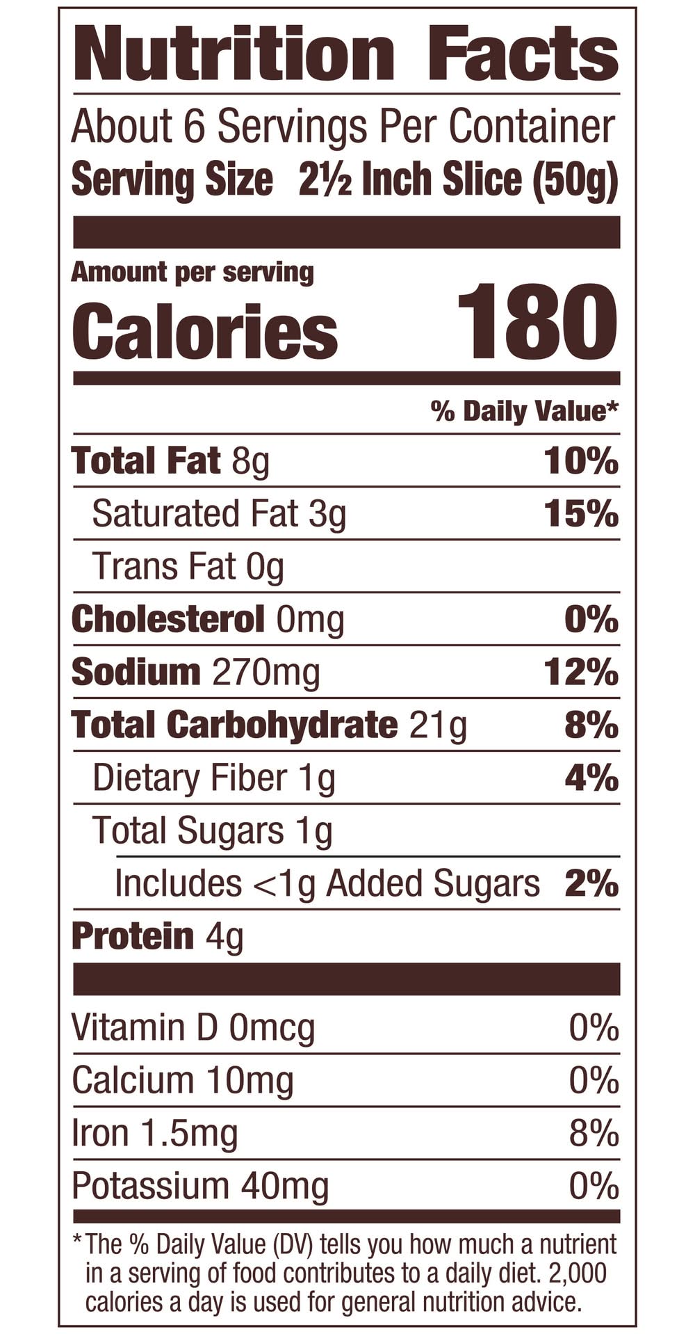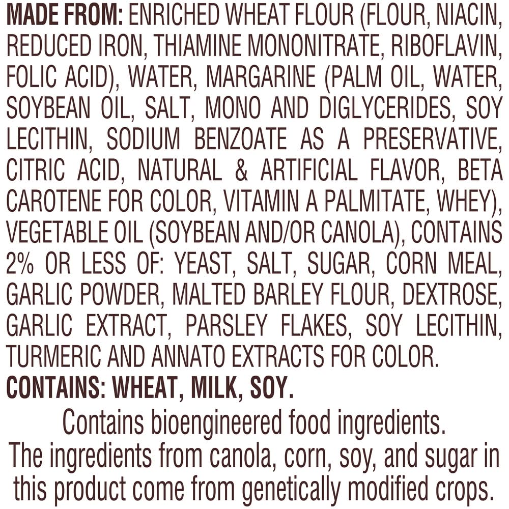 Ingredients: MADE FROM: ENRICHED WHEAT FLOUR (FLOUR, NIACIN, REDUCED IRON, THIAMINE MONONITRATE, RIBOFLAVIN, FOLIC ACID), WATER, MARGARINE (PALM OIL, WATER, SOYBEAN OIL, SALT, MONO AND DIGLYCERIDES, SOY LECITHIN, SODIUM BENZOATE AS A PRESERVATIVE, CITRIC ACID, NATURAL ARTIFICIAL FLAVOR, BETA CAROTENE FOR COLOR, VITAMIN A PALMITATE, WHEY), VEGETABLE OIL (SOYBEAN AND/OR CANOLA), CONTAINS 2% OR LESS OF: YEAST, SALT, SUGAR, CORN MEAL, GARLIC POWDER, MALTED BARLEY FLOUR, DEXTROSE, GARLIC EXTRACT, PARSLEY FLAKES, SOY LECITHIN, TURMERIC AND ANNATO EXTRACTS FOR COLOR. CONTAINS: WHEAT, MILK, SOY Contains: CONTAINS: Gluten, Milk/Dairy, Soybean, Wheat