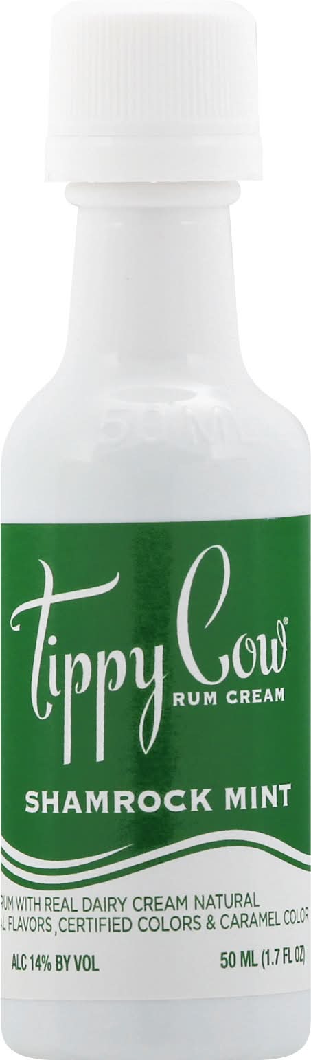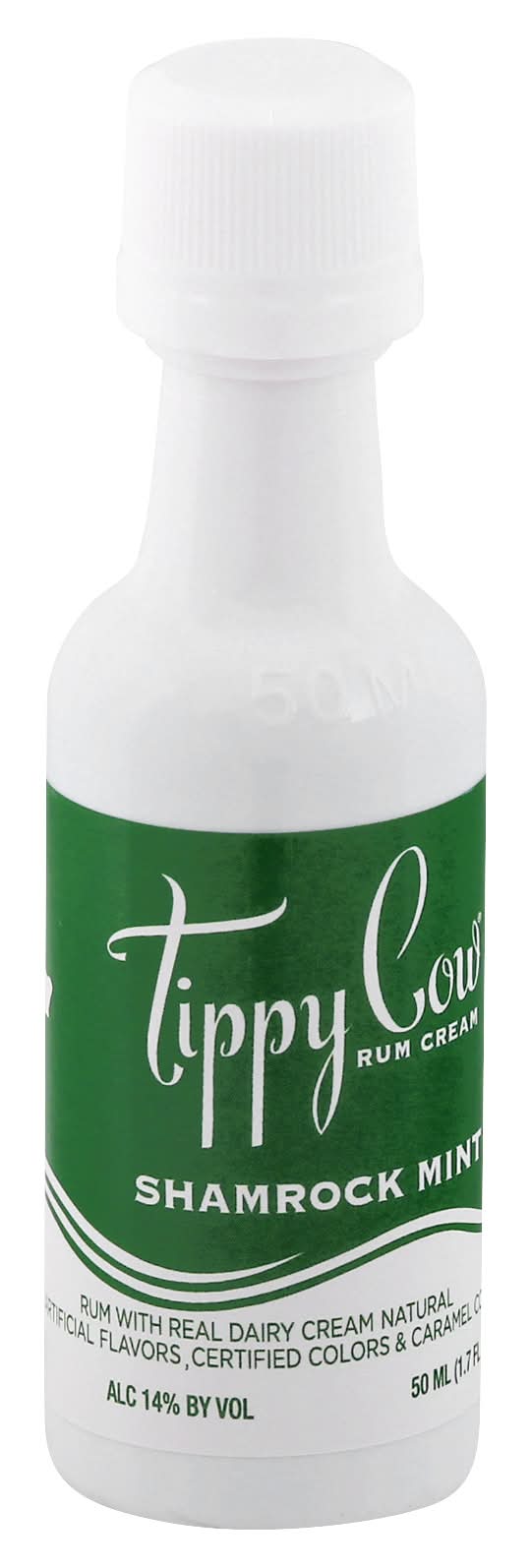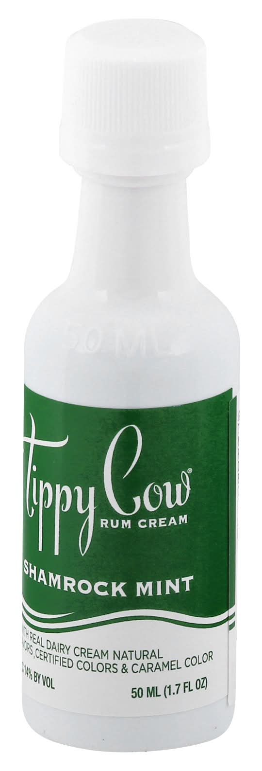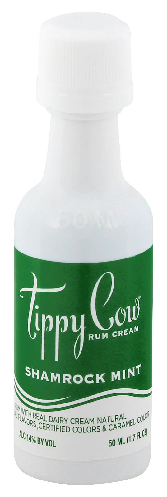 Rum with real dairy cream, certified colors & caramel color. Natural & artificial flavors. Tippy Cow Shamrock Mint tastes just like a delicious mint ice cream. Try it on the rocks, straight up, or in a cup of hot chocolate or coffee, but be prepared to share because Tippy Cow always draws a crowd! Made with real dairy cream. Alc 14% by vol. Bottled by: Midwest Custom Bottling, Pewaukee, WI. • Alcohol by volume: 0.14% • MIDWEST CUSTOM BOTTLING,