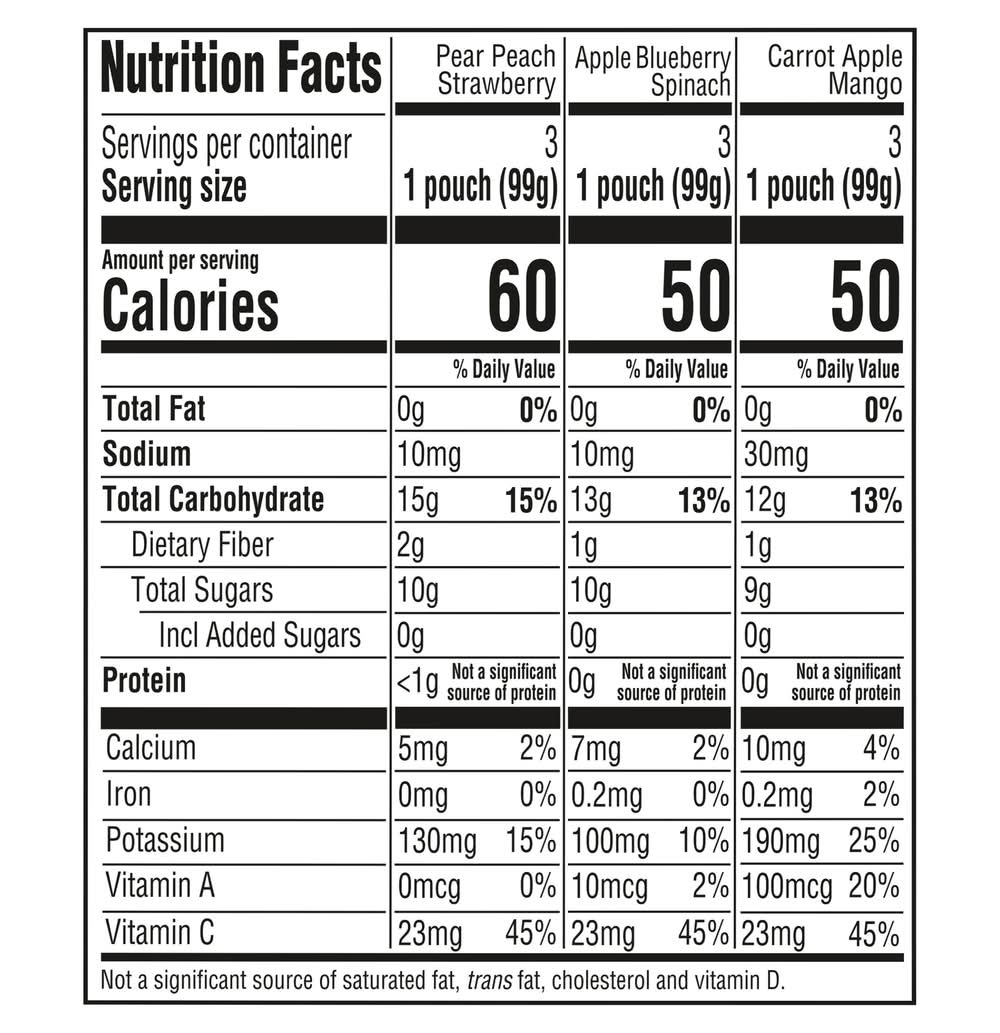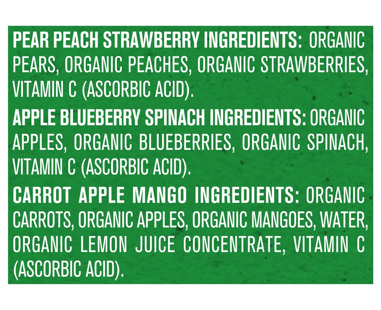 Ingredients: Pear Peach Strawberry Ingredients: Organic Pears, Organic Peaches, Organic Strawberries, Vitamin C (Ascorbic Acid).Apple Blueberry Spinach Ingredients: Organic Apples, Organic Blueberries, Organic Spinach, Vitamin C (Ascorbic Acid).Carrot Apple Mango Ingredients: Organic Carrots, Organic Apples, Organic Mangoes, Water, Organic Lemon Juice Concentrate, Vitamin C (Ascorbic Acid).