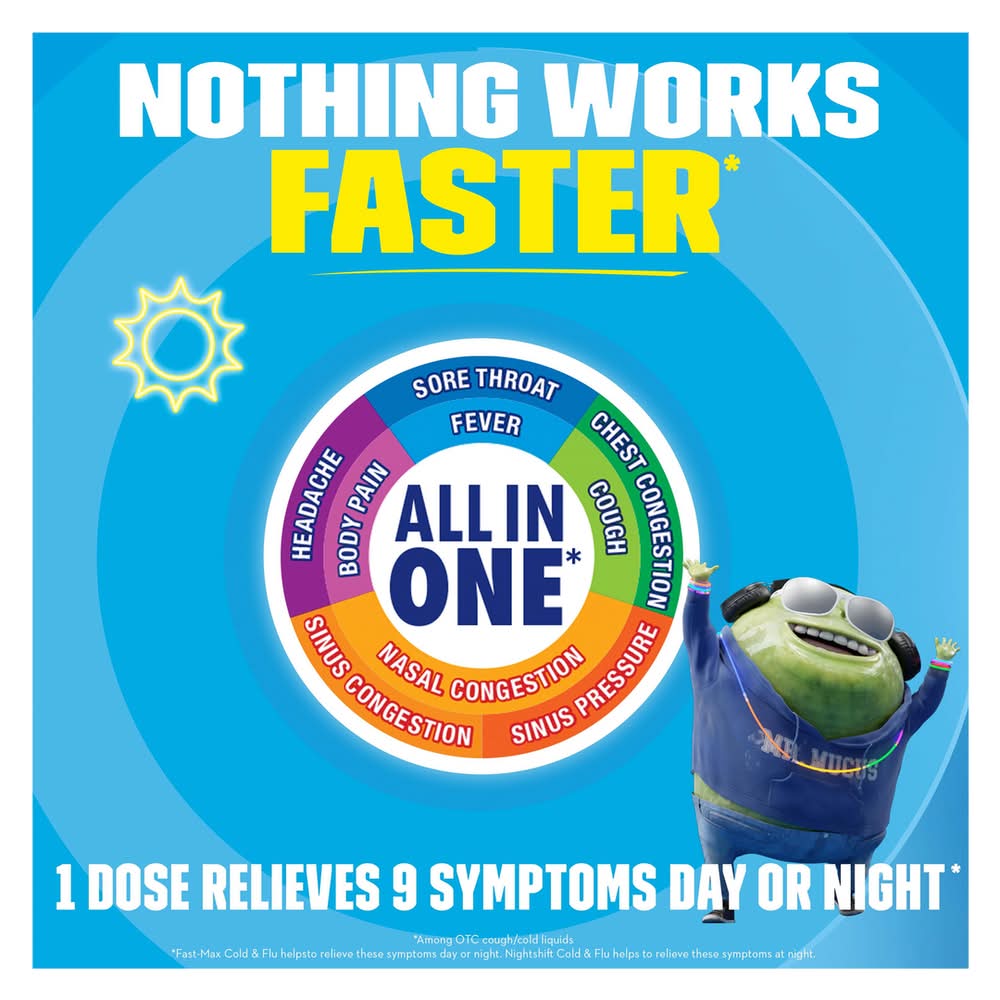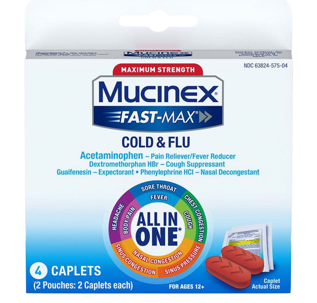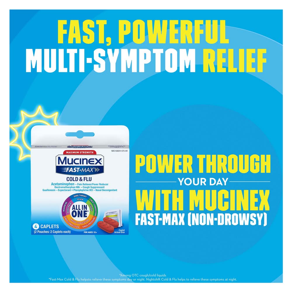Maximum Strength Mucinex Fast-Max Cold & Flu is a Multi-Symptom Relief medicine for your Cold & Flu Symptoms. Maximum Strength Mucinex Fast-Max Cold & Flu All In One helps reduce fever and relieve cough, sore throat, stuffy nose, chest & nasal congestion, headache and minor aches and pains. Mucinex is the #1 most trusted brand among doctors for Cold, Cough and Chest Congestion symptoms for themselves and their families* and #1 Pharmacist Recommended Brand †. This product contains 4 Caplets (2 Pouches containing 2 Caplets each). Use as directed, for Adults and Children 12 years of age and over. SYMPTOMS RELIEVED: Maximum Strength Mucinex Fast-Max Cold & Flu All In One helps reduce fever and relieve cough, sore throat, stuffy nose, chest & nasal congestion, headache and minor aches and pains Size: 4 CT